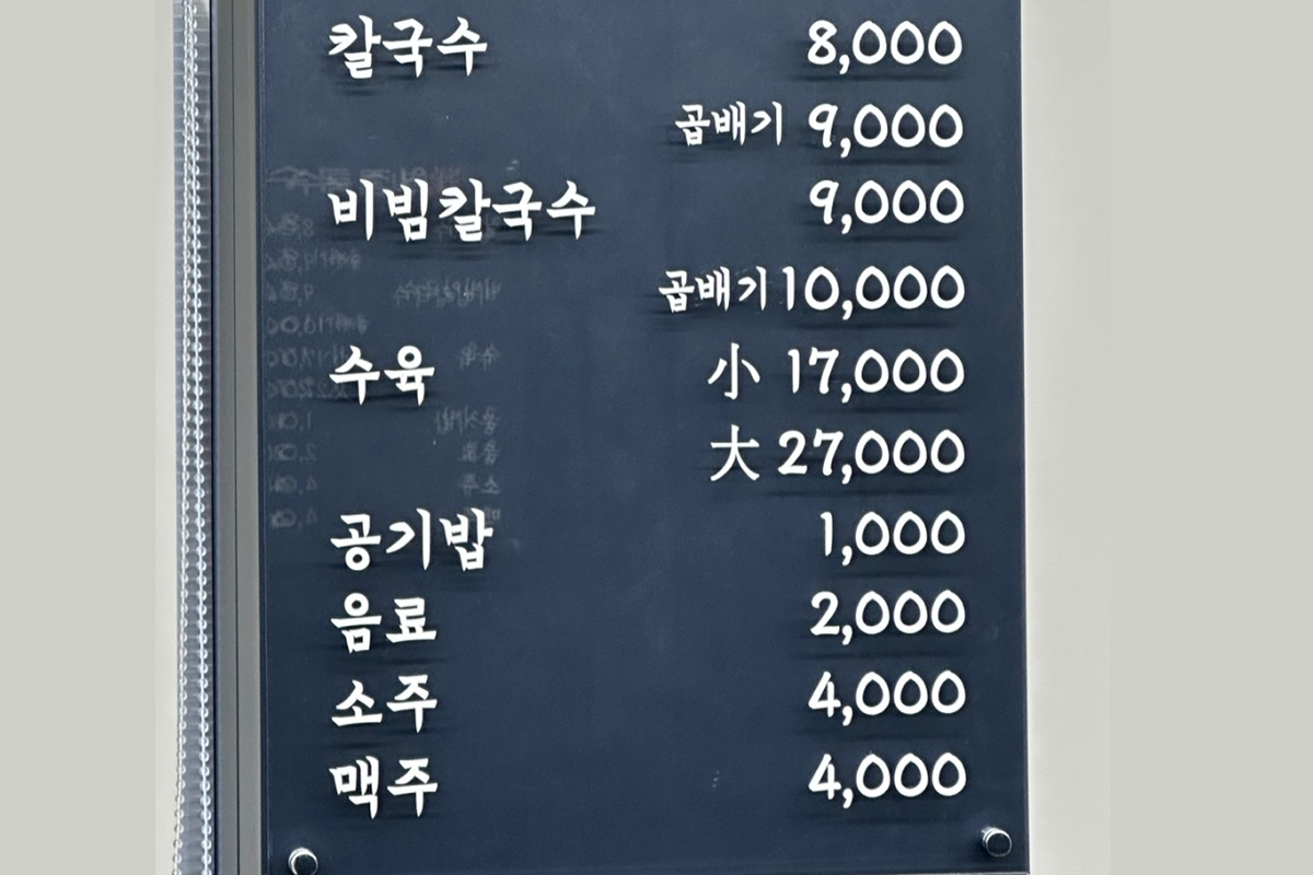 菜单很简单,刀削汤面(칼국수)₩8,000、刀削拌面(비빔칼국수)是₩9,000 ,小份水煮白肉是₩17,000,想要加点白饭则是一碗₩1,000、加面则是₩1,000。