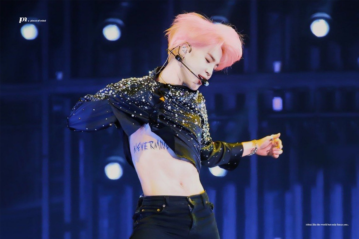 和柾国一样,Jimin也有很多好看又很有意义的刺青。腰上「NEVERMIND」文字图案,虽然不太清楚是刺青还是纹身贴纸(?)但因为非常有名,就列入这次的介绍名单。不单只有粉丝,连路人都知道Jimin这个肋骨刺青,也是舞台上众多令人印象深刻的一幕之一。