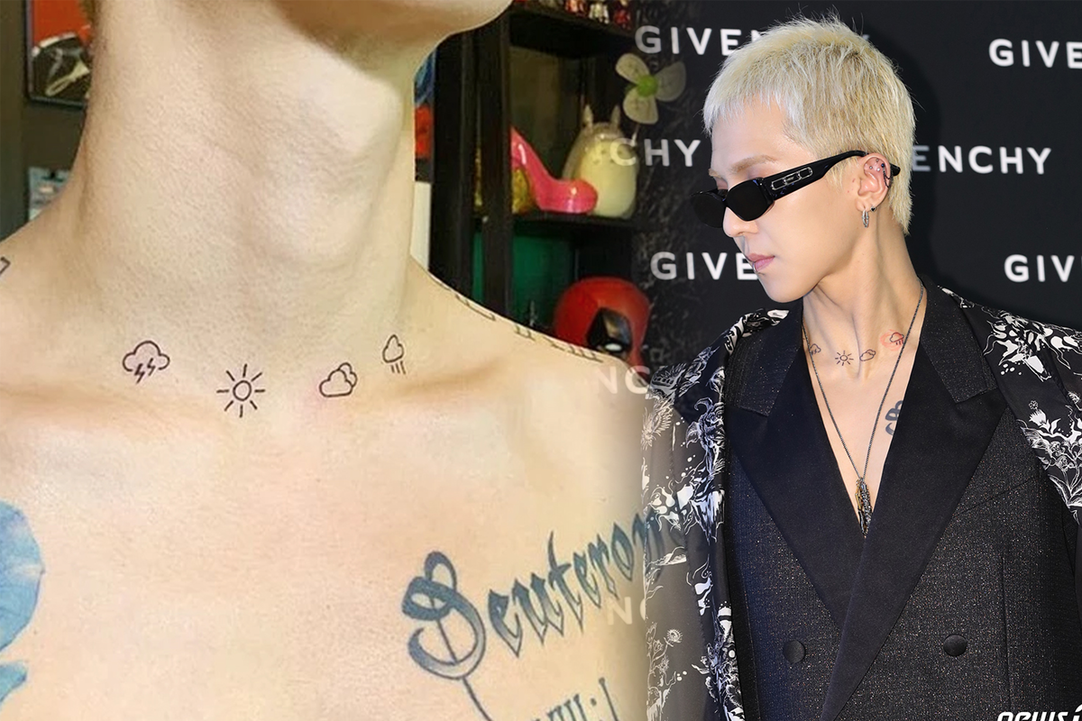 除此之外,很多人都模仿过的天气刺青,既简单可爱又能突显个性。沿著锁骨线条依序刺著闪电、太阳、多云、雨天的图案。屋哩可爱的是宋旻浩经常根据当日天气在相对应的图案上画一个红色圈圈,可说是人体天气报告?