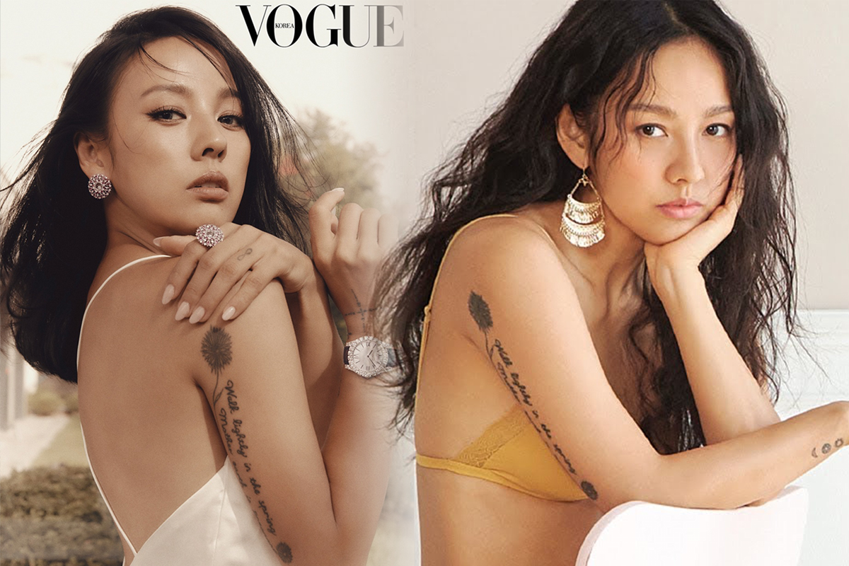 李孝利的刺青则是偏向复古风格,先前,她因为响应环保而备受瞩目,右臂后面则刺上了印第安俗语「Walk lightly in the spring, Mother earth is pregnant(迎接所有生命苏醒的春天)」,也将地球比喻为孕育生命体「母亲」。