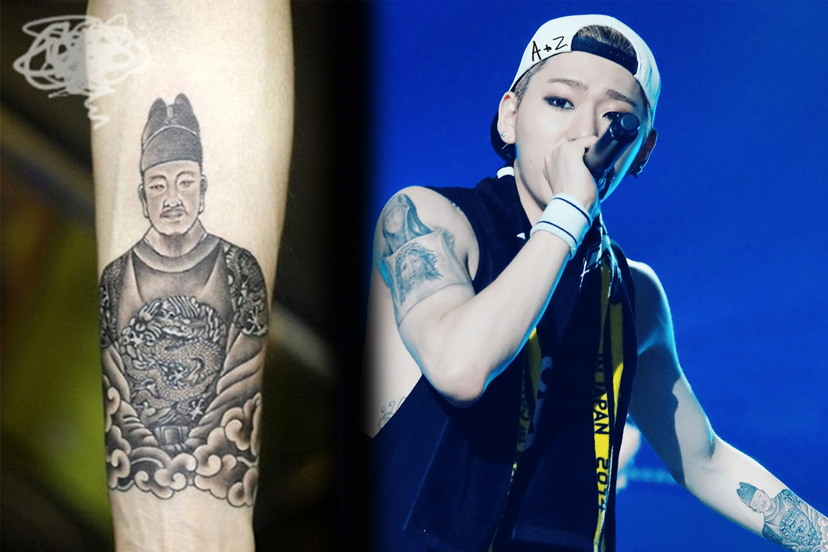 Zico也是以刺青非常多而出名,特别是身为Rapper的他,与歌词相关的刺青也不少呢。他曾表示,创造韩文的世宗大王令他感到非常尊敬(因此才会有这么多华丽的Rap歌词),所以就将世宗大王刺在手臂内侧。