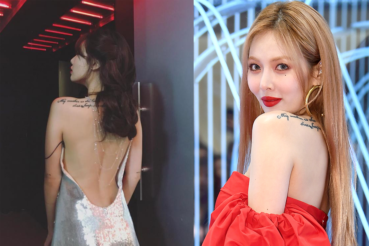 泫雅也是演艺圈拥有非常多刺青的艺人,相信不用小编说,大家应该都知道吧?泫雅身上大大小小的纹身都充满独特风格,最有名的刺青应该就是肩上的文字刺青了!只要穿上能露出漂亮肩线的衣服就能看见,因此很多韩国人都喜欢在这里刺青。