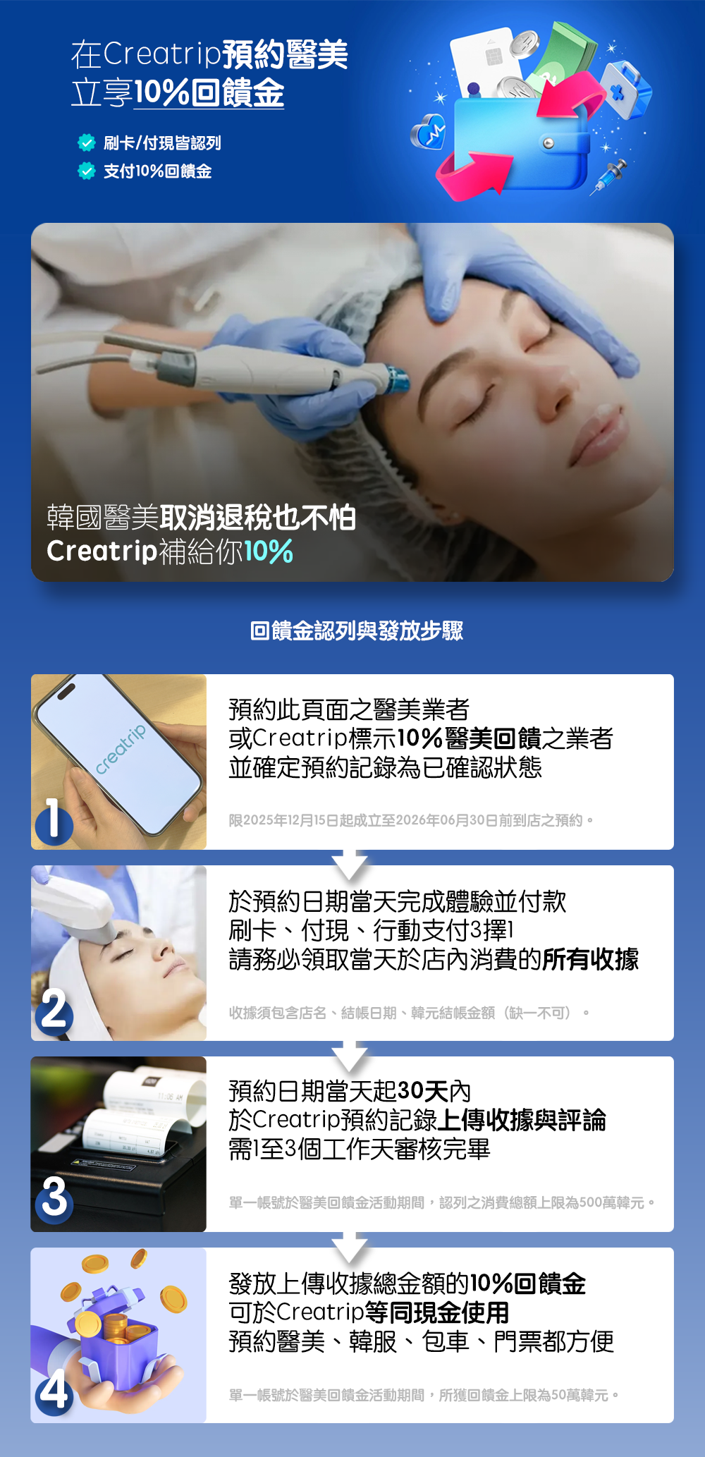 注意事项本活動期限至2026年06月30日止;實際舉辦期間將視營運狀況,可能提前終止或延後結束。若發生取消Creatrip網站預約、未實際進行療程、現場未完成付款等情形,將視為未具實際體驗事實,Creatrip有權不予發放回饋金,或收回以不當方式取得之回饋金。即使透過Creatrip預約指定店家,若於療程完成後30日後才填寫評論並上傳收據,因已逾申請期限,恕無法提供回饋金。已上傳之收據恕不接受修改或刪除;如誤傳檔案或需進行內容調整,請聯繫客服中心(help@creatrip.com)協助處理。回饋金之發放時間將依實際審查進度為準,可能提前或延後。 若經確認透過AI或人工變造、非本人實際體驗等不當方式取得收據或回饋金,Creatrip有權限制該會員之相關服務使用權限。本活動政策得依營運需要隨時調整或刪減,恕不另行通知,請以活動當下公告之規定為準。