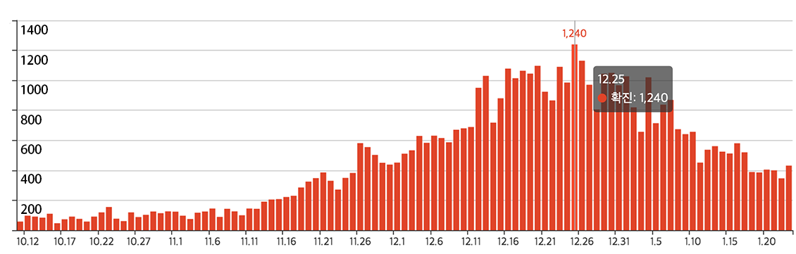 中秋连假过后,韩国疫情缓缓上升,防疫当局虽强力呼吁众人克制群聚,但也为时已晚,疫情于2020年12月起出现了大反扑,屡屡创下新高。
