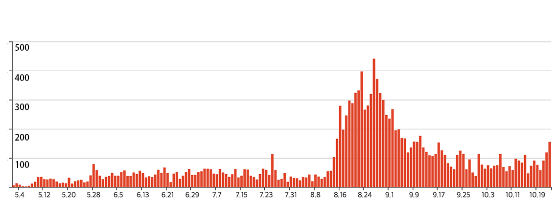 虽然在815集会后,韩国花了与平复大邱新天地教会群聚感染潮,差不多的两个月时间,在十月中下旬控制疫情在每日100例上下。但是,感染链已深入首都圈的社区,加上政策反反复复,持续下降、上调防疫层级,也让民众疲惫不堪。