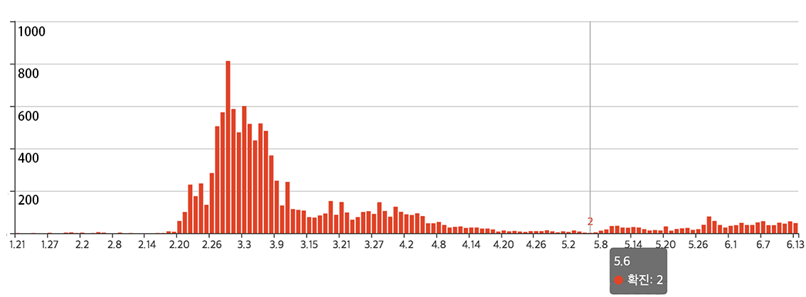 时间轴回到2020年02月18日,第31例病例于大邱出现,为大邱新天地的第一号感染者。隔天起,短短一周时间,每日新增病例数就突破200例;两周过去,单日新增病例数就突破500,最高更来到800。而韩国累积超过四千例感染者,仅花了不到两个礼拜,于03月03日突破了4,812例。