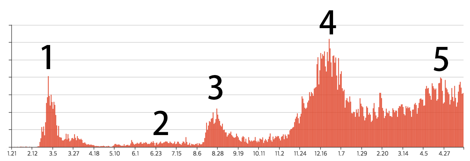 从上方的图可以清楚看到,韩国在2020年01月21日出现首例新冠肺炎感染病例后,历经了三波疫情高峰阶段(编号1、3、4),而从2021年开始,疫情就再也降不下来,呈现长期化的疫情高峰阶段,虽然偶有增减但仍是增长趋势。