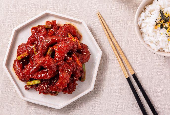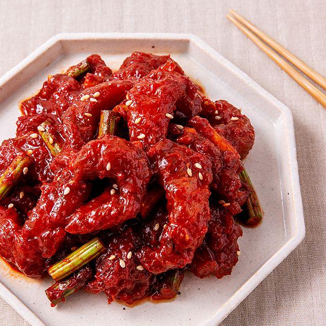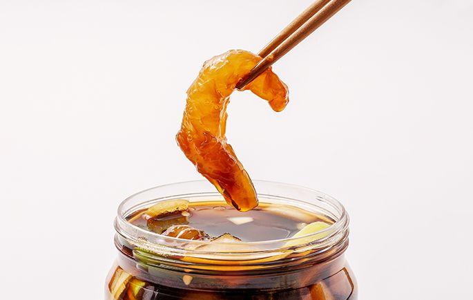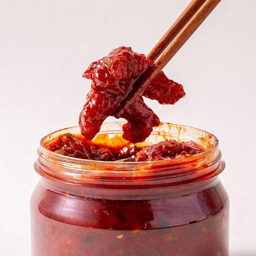用上韩式辣酱、大葱腌制而成,这罐酱料虾辣辣的口感,比普通酱油虾更下饭。另外,利用满满的酱汁,煮炒饭和韩式拌饭都非常适合。