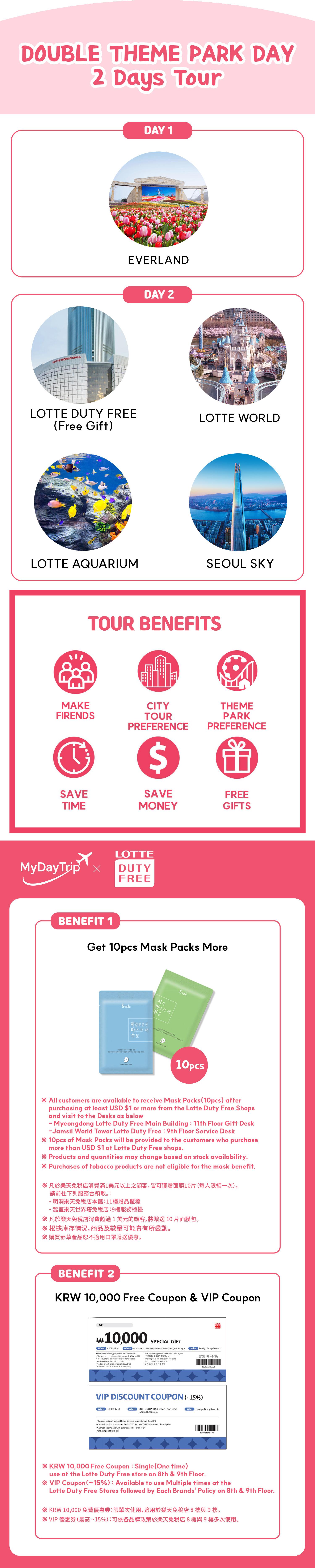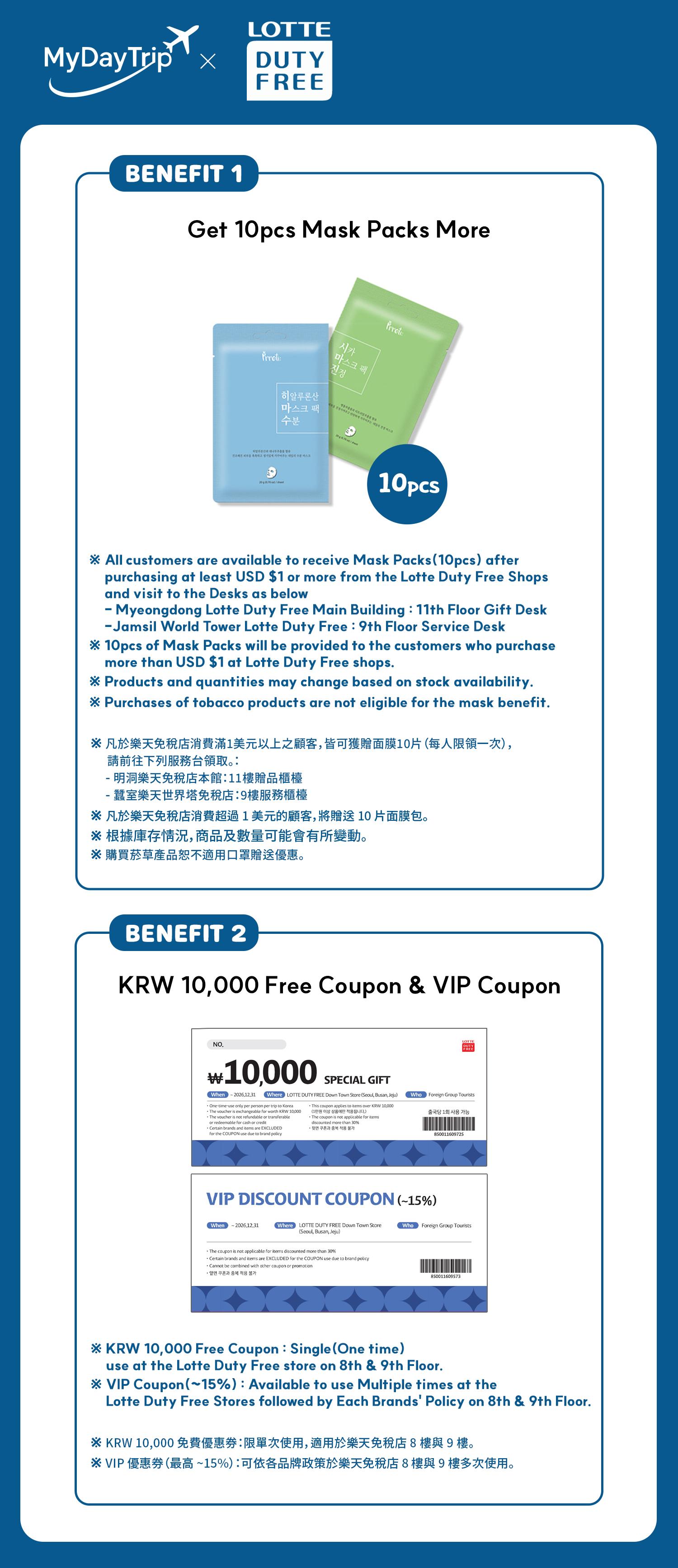 来乐天免税店体验特别礼遇,包括KRW10,000商品券、VIP折扣券,以及10片免费口罩。