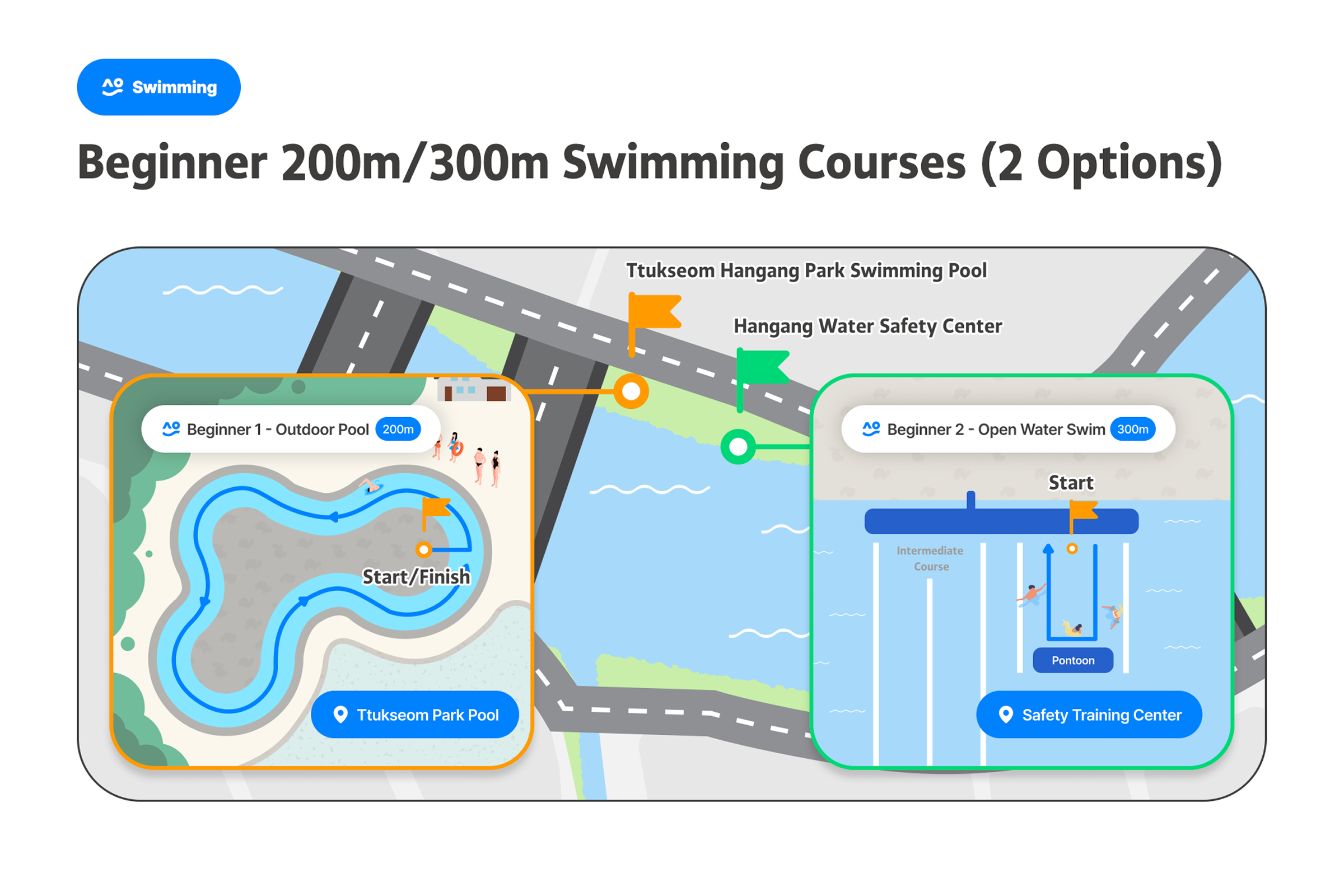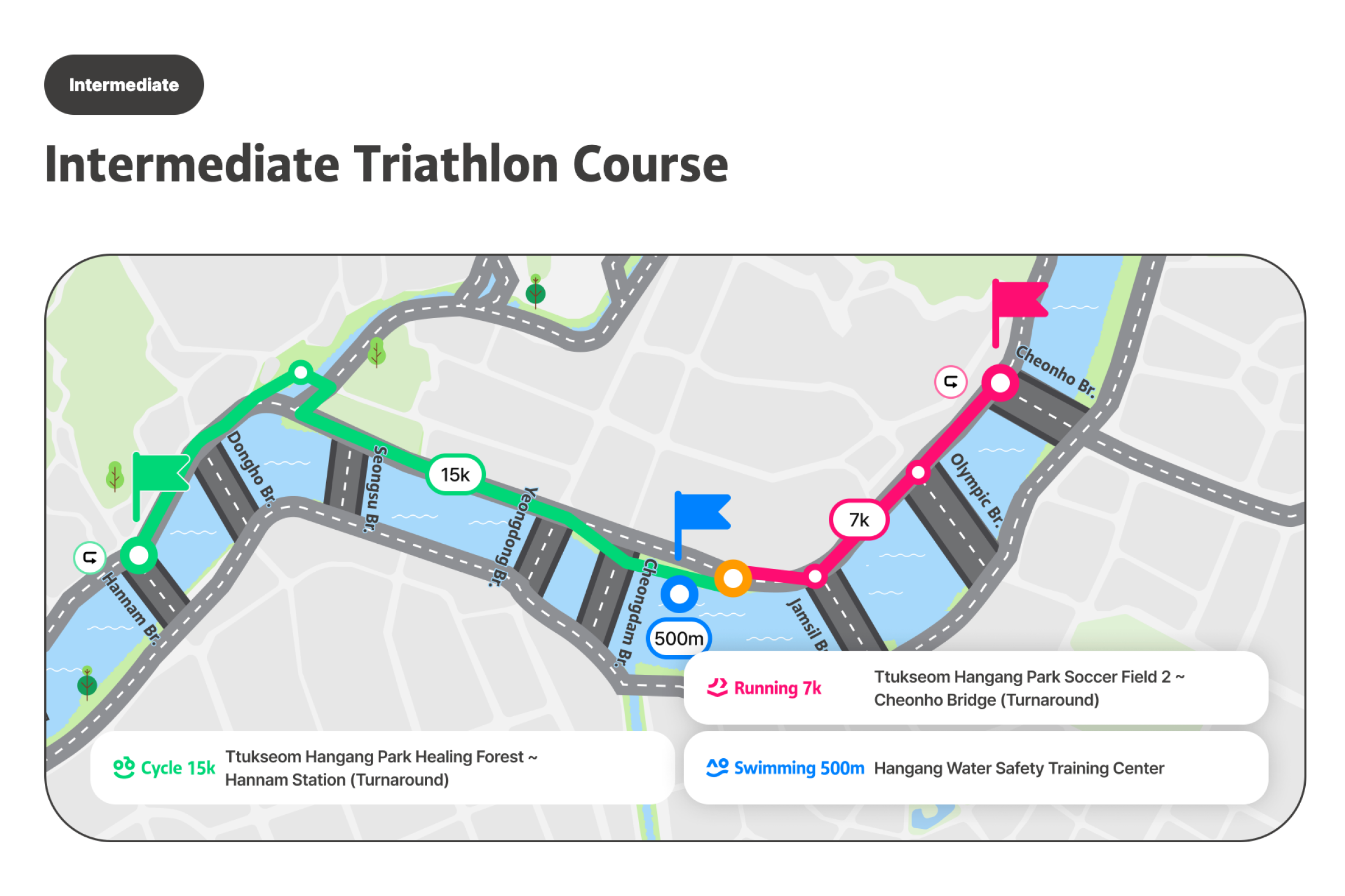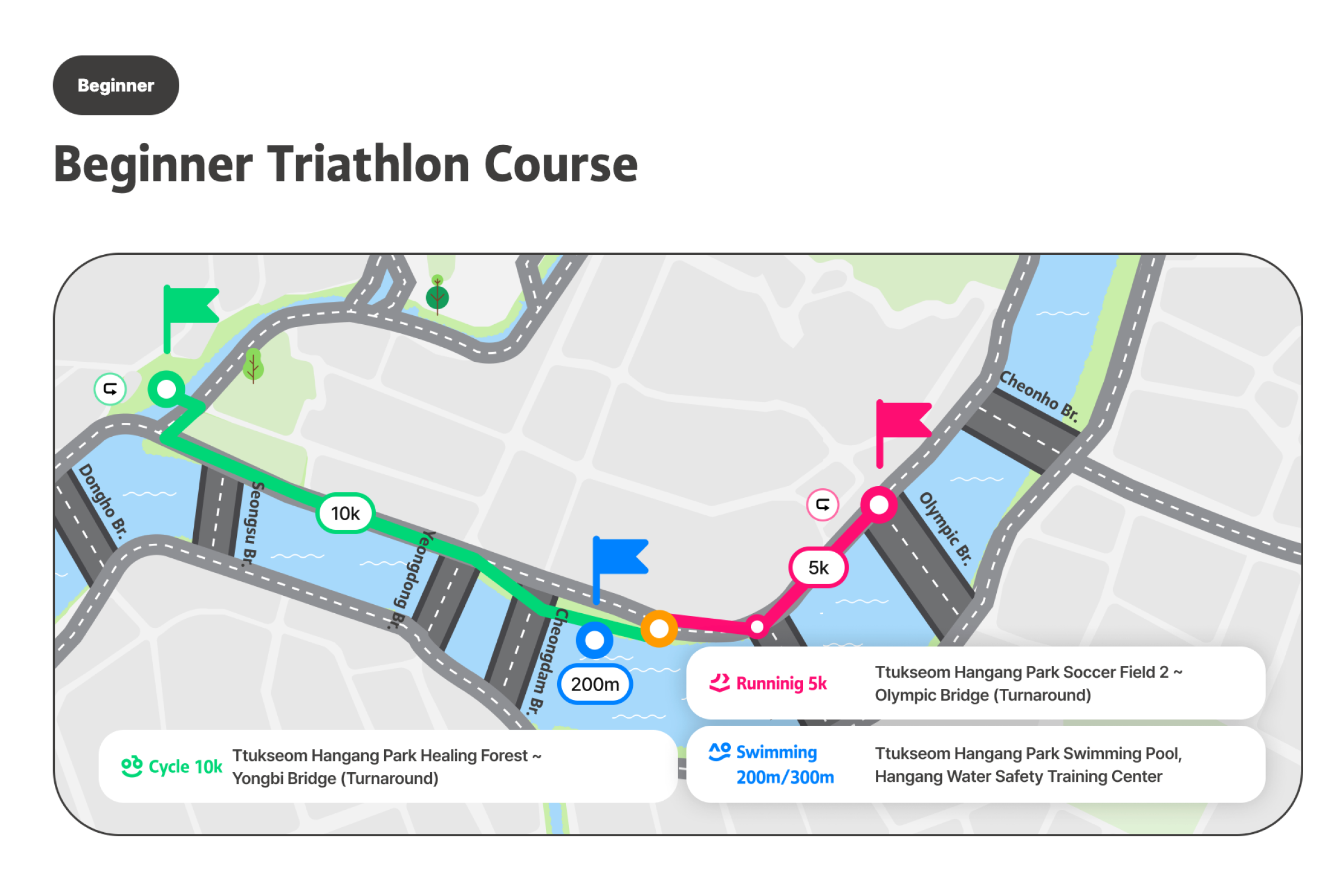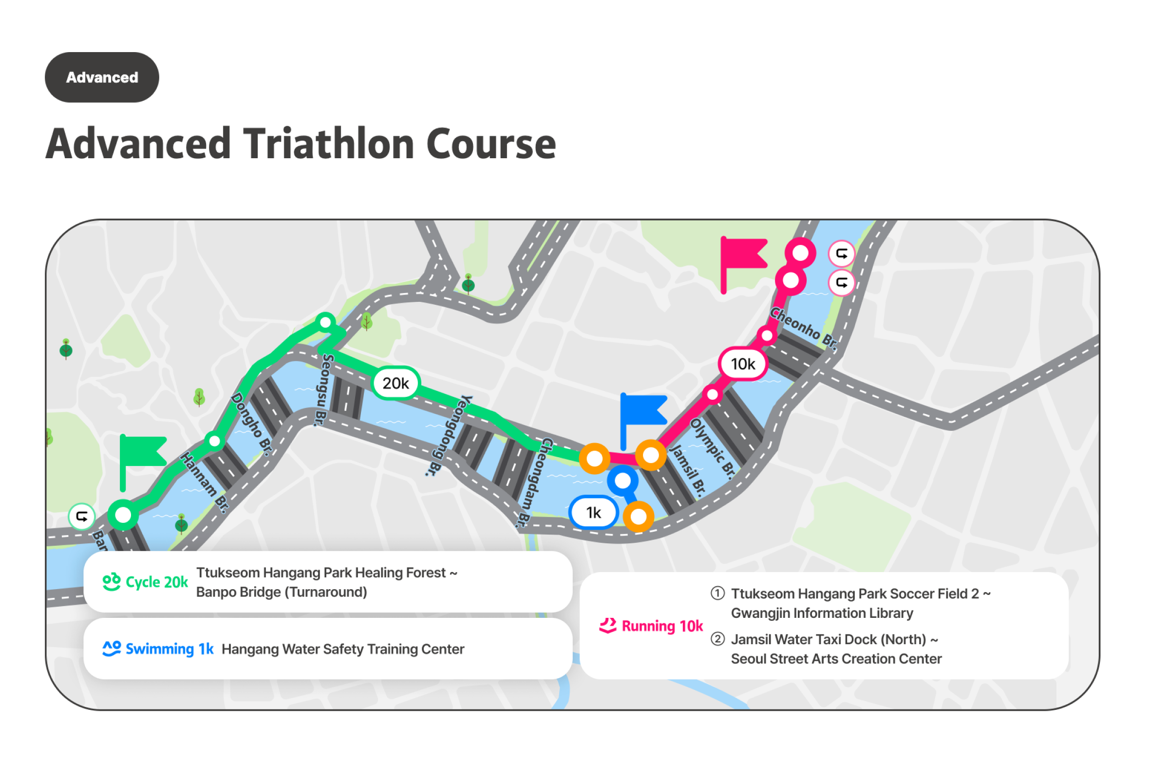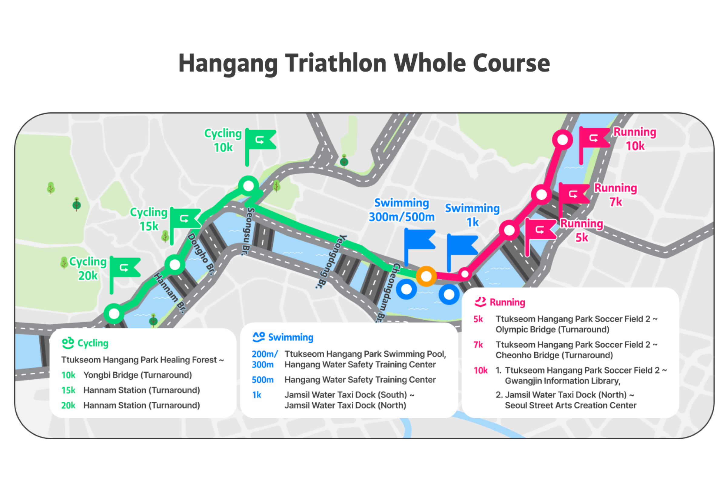 成为世界上最悠闲的三项铁人赛,慢慢享受 的铁人选手吧!汉江三项节是像名字一样,不以名次或纪录、竞争为目的,完成游泳、自行车、跑步的运动节庆。比起运动竞赛更像是庆典,不会计算纪录或排名。以自己的速度与方式、适时休息,和当地人一起完成铁人三项,完成特别的奖牌。有3万名在地人参与、值得信赖的首尔市节庆[图片滑动] 这是由首尔市主办、可信赖且安全的活动。是在汉江体验跑步、自行车和游泳的非常特别的机会。对韩国人已经售罄,只针对外国人限量200张,先到先得。可以一边欣赏美丽的汉江,一边自然地与当地人互动。各种节庆活动同时举办,走走、跑跑、休息一下,一起享受节庆氛围吧。可以获得特别的纪念奖牌,能带来成就感并得到漂亮的纪念品。此外,所有参加者都会收到纪念T恤,留住节庆回忆。穿上T恤在汉江拍张认证照再合适不过了!预先报名时会提供额外赠品,让活动更加丰富。提前报名并拿到特别礼物吧。自由的出发与抵达[图片轮播] 您可在预约的日期时间带内,依照自己的体能状况,任何时候开始。但为了顺利进行,预约时需选择上午(09:00~12:00)或下午(12:00~18:00)时段,请于该时段内到场参加。完成报到后,三项赛目(游泳、骑车、跑步)不必一次完成。活动期间可依个人速度分次完赛并领取奖牌。但游泳开始时间请依指示进行。高阶路线的基本运作方式相同,但因为横越汉江的1km游泳路线,游泳项目的出发与结束时间有固定规定。项目顺序可自由选择。(但为安全考量,建议高阶路线先进行游泳。)活动说明活动名称 : 2026 第3届MY PACE Hangang Triathlon Festival 汉江三项节活动日期 : 2026.06.05(四) ~ 06.07(六)地点初级/中级 : 纛岛汉江公园一带 (首尔特别市广津区 紫阳洞)高级 : 蚕室水上计程车码头南端 (首尔特别市松坡区 蚕室洞1-1)路线说明1. 初级[图片走马灯] (游泳 #1路线)🏊♀️ 游泳: 游泳池200m (뚝섬游泳池)5岁以上(2021年以前出生)可参加身高100cm以上🚲 自行车10km🏃♀️ 跑步5km(游泳 #2路线)🏊♀️ 游泳: 汉江 游泳300m13岁以上(2013年12月31日之前出生)即可参加🚲 单车 10km🏃♀️ 跑步 5km2. 中级[图片滑动器] 🏊♀️ 游泳: 汉江游泳500m可参加年龄为13岁以上(2013年12月31日以前出生)🚲 单车15km🏃♀️ 跑步7km3. 进阶级[图片轮播] 🏊♀️ 游泳: 汉江横渡1km (蚕室水中坝南端~北端)13岁以上(2013年12月31日以前出生)即可参加需穿著全身泳衣(现场可付费租借,20,000韩元)🚲 单车 20km🏃♀️ 跑步 10km参加优惠完成2个以上路线可获得奖牌参加者纪念T恤赠送防晒贴片事前登记者额外好康(能量饮料等)