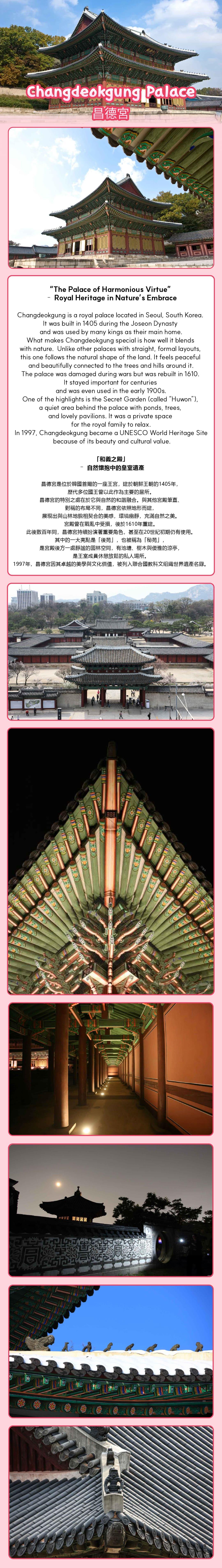 - 昌德宫尽量保留自然地形,是朝鲜王朝国王们停留最久的宫殿。后苑(秘苑)导览在国内外观光客中特别受欢迎,是窥见王室悠闲日常的好去处。