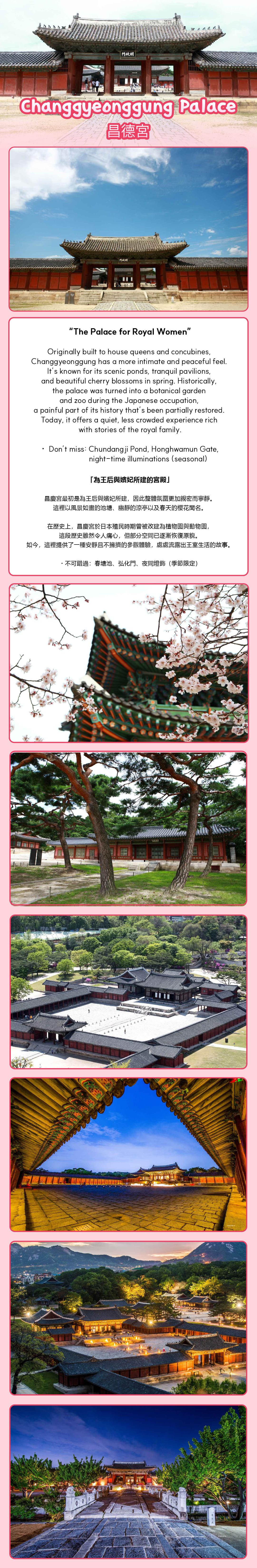 - 成宗为了母亲与太妃所建的昌庆宫,是充满家庭意义的空间。相比其他宫殿虽然朴素却温馨,春天的樱花与秋天的枫叶景点也非常著名。