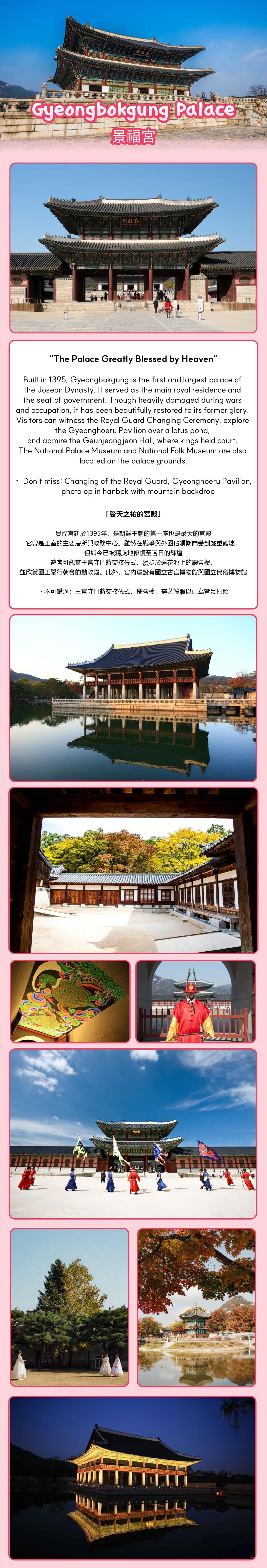 - 1395年太祖李成桂创建的朝鲜第一座宫殿。景福宫以勤政殿、庆会楼、香远亭等,是韩国古宫中最华丽且规模最大,象征朝鲜王朝的正统性与权威。