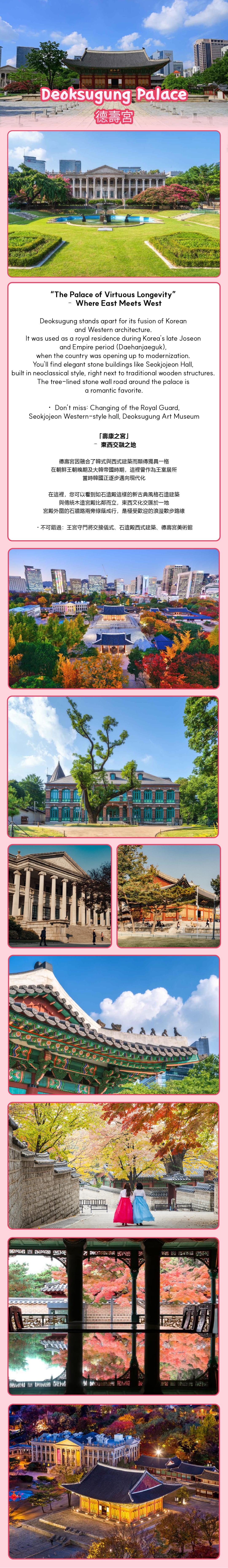 - 位于首尔市中心,石造殿与中和殿相互辉映的德寿宫,是大韩帝国遗迹仍留存的宫阙。带有近代元素的独特建筑美格外显眼,并且是高宗皇帝度过最后时光的历史场域。