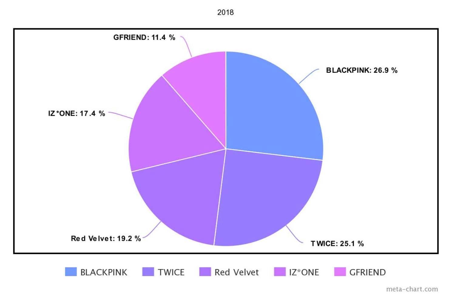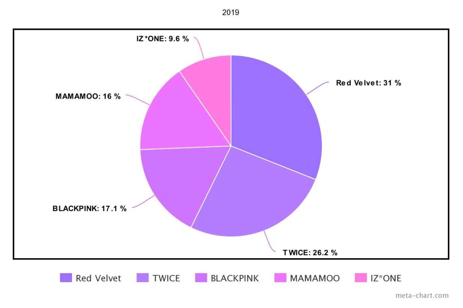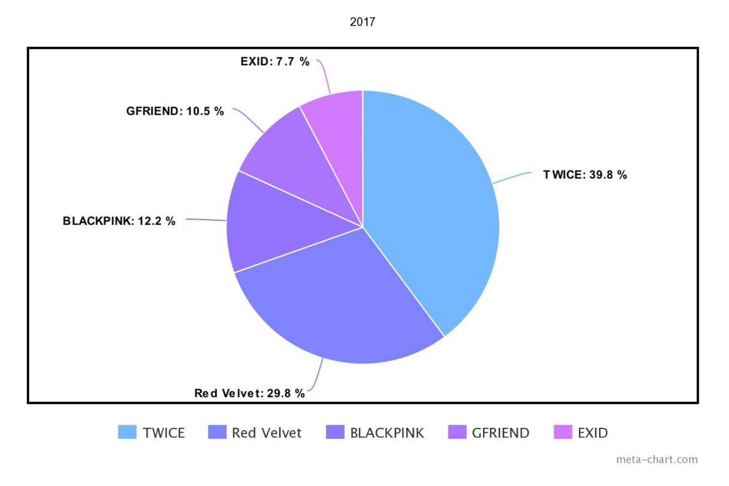 2016年最具影響力的K-Pop女團排名餅圖,最高人氣的是TWICE,其次是Red Velvet和2NE1。