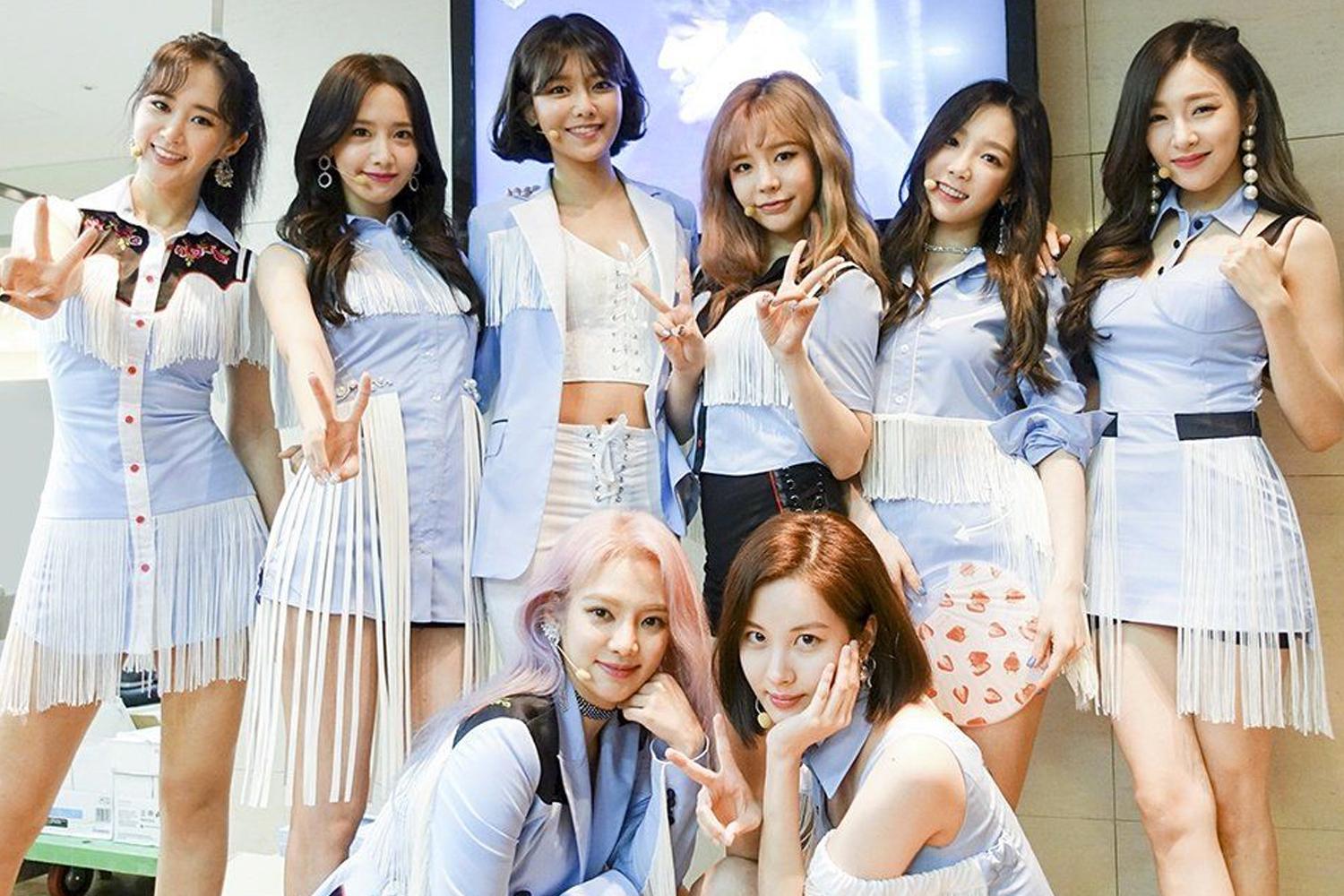 2015年2015年韓國女團少女時代的照片,八位成員集體站立,以色彩繽紛的舞台服裝亮相。