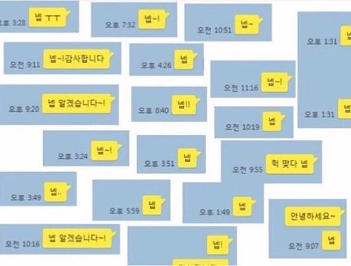 韓國人好興喺msg嗰度用嘅就係加入終聲「ㅂ」,等個msg嘅語氣冇咁僵硬。「ㅂ」係韓國其中一個子音,佢喺初聲嘅時候會發類似「b」音,喺終聲嘅時候就會發「p」嘅收尾音(類似英文sub, soup, bob之類嘅收音)。而韓國人最常就係會喺「네(ne)」嗰度加「ㅂ」,變成「넵(nep)」,會令成個氣氛親切少少。小編最多係同新朋友傾偈或者自己學系嘅Kakaotalk group入面會用,都有唔少韓國打工仔會用,佢哋話咁樣同上司講嘢,冇咁死板之外,仲更加show到自己有熱誠、 積極同有禮貌嘅感覺喎。