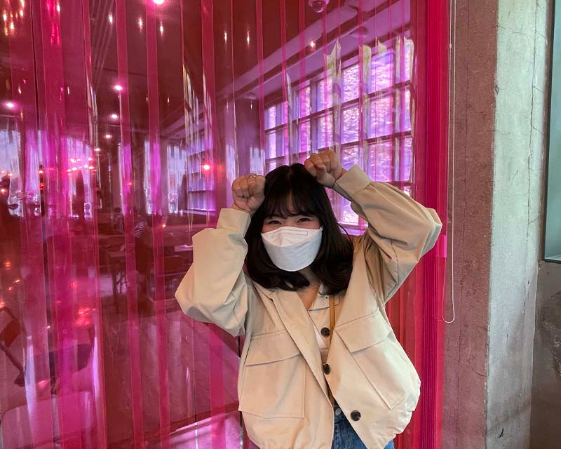 見到呢個粉紅色嘅簾,就諗起V喺度影過相,我哋都唔執輸,學V咁擺pose咁影返張先!