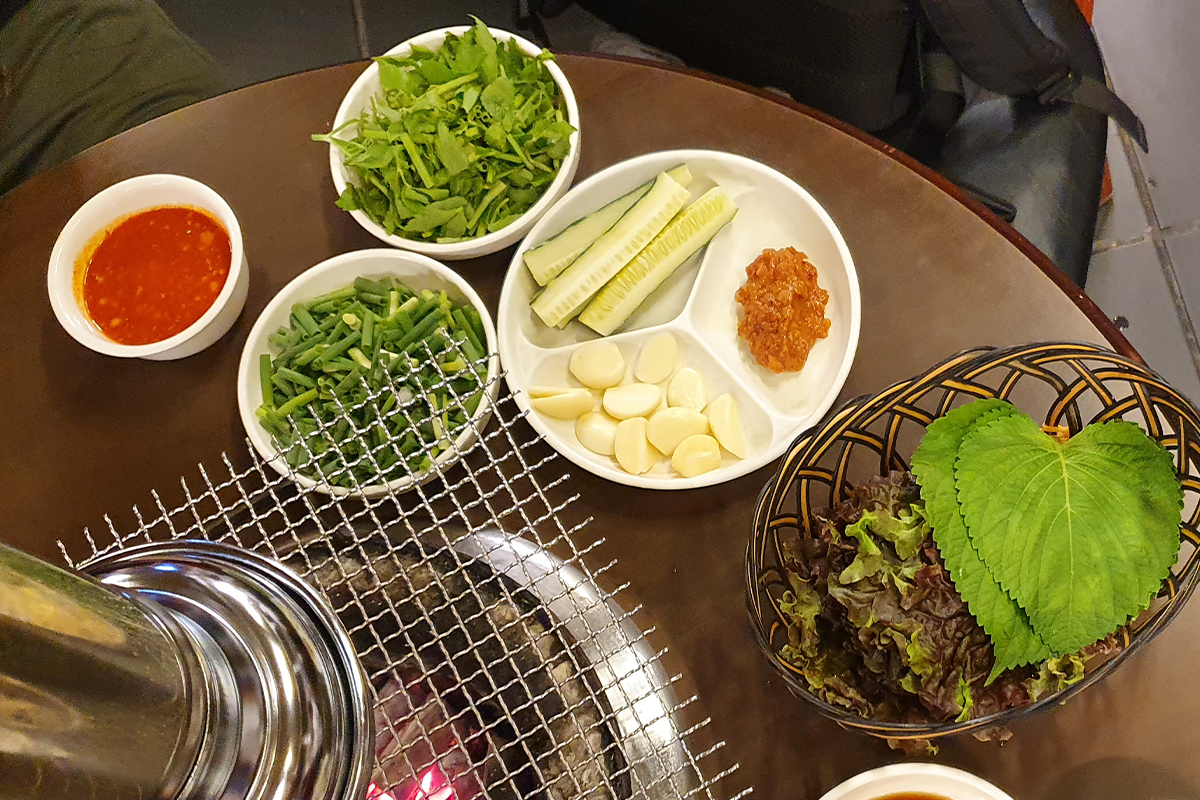 小菜就比較簡單,有包住烤腸嚟食嘅芝麻葉、生菜,同青瓜、大蒜、包飯醬。