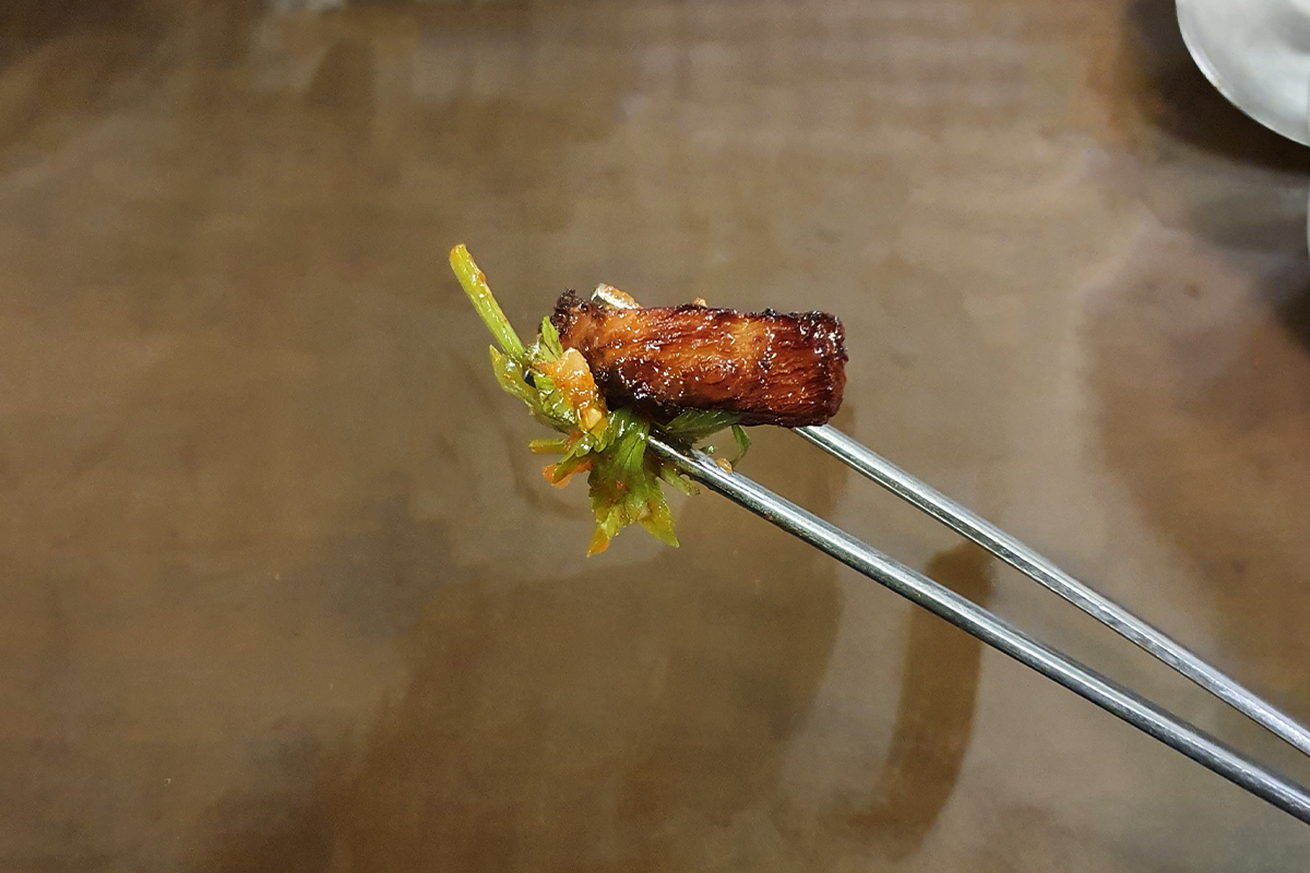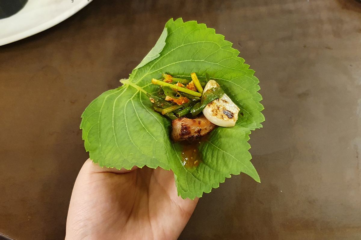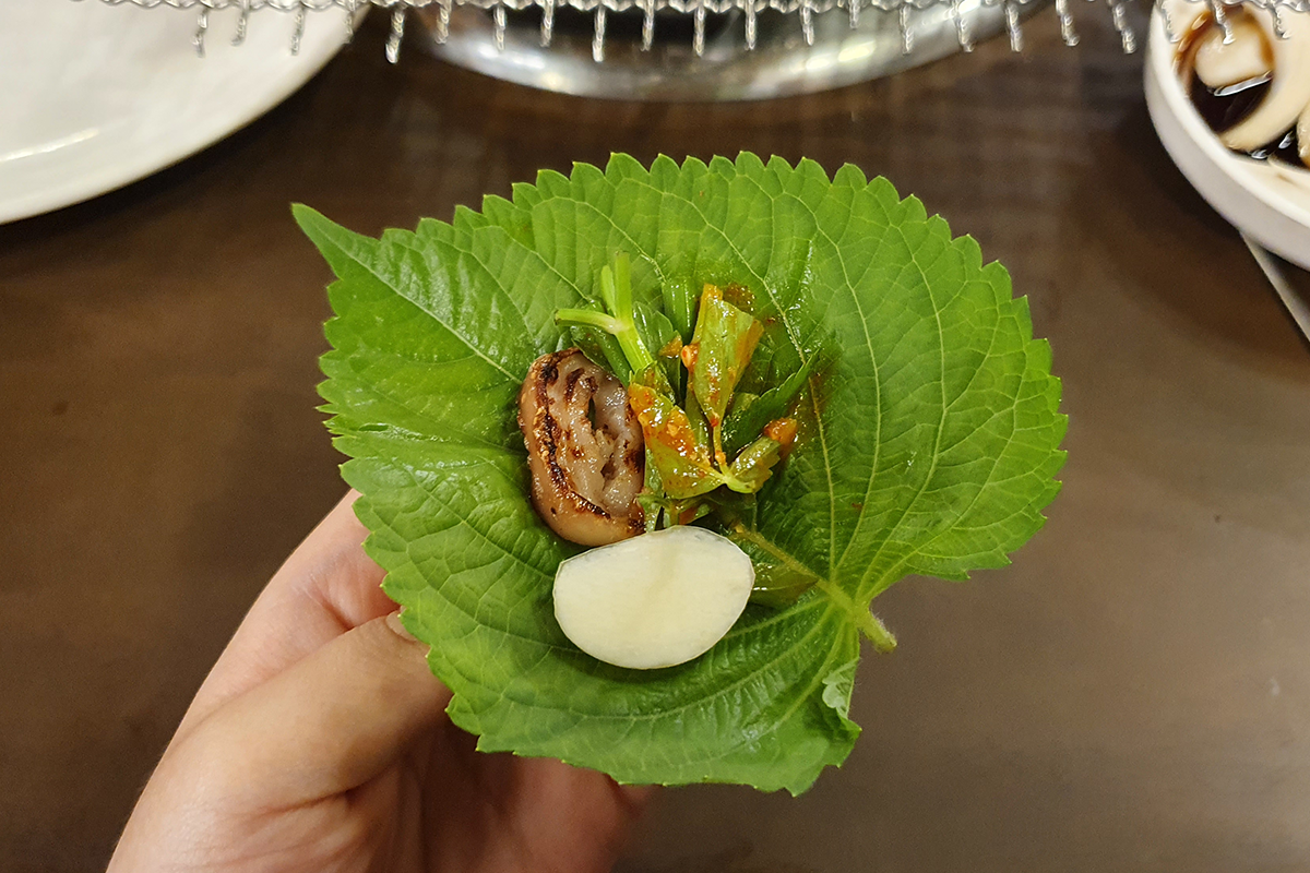 第二個方法係包菜食,將豬腸連埋大蒜等放上生菜或者芝麻葉度,加少少包飯醬一齊食,真係好香又有咬口。 小編本身仲擔心有陣豬內臟嘅特別味道,不過咁樣食真係好好味!