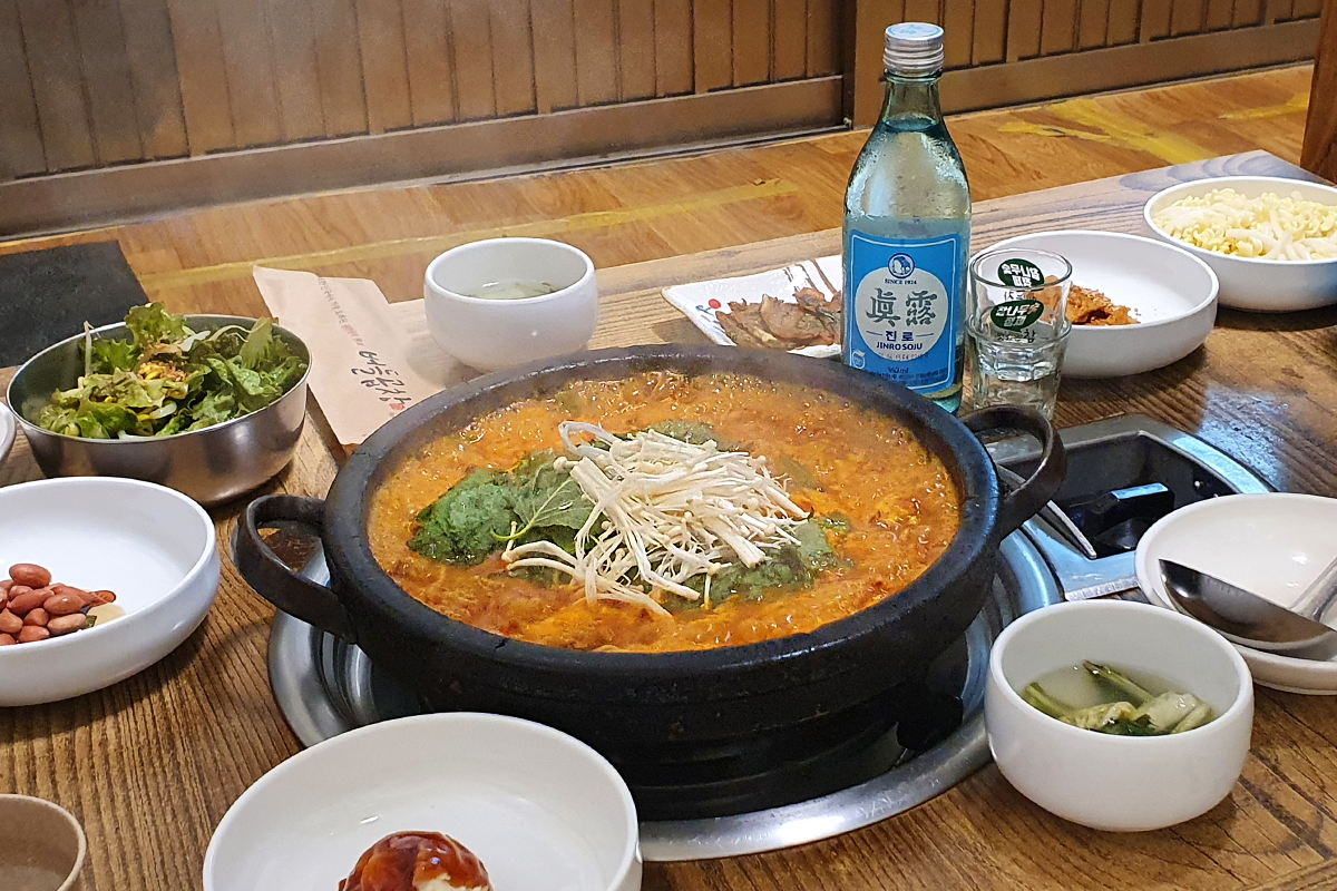 韓國人食呢種熱辣辣嘅火鍋時都會飲燒酒,所以小編都叫咗一支! 煮到熱辣辣嘅火鍋入面,放滿芝麻葉同金針菇。職員上菜嘅時候已經差唔多熟,所以只要等多一陣完全熟透再食就可以。