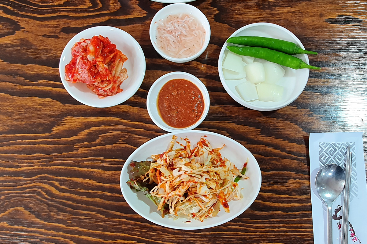 小菜非常簡單,有kimchi、洋蔥、辣椒,同埋掠拌野菜。 涼拌野菜係將椰菜、生菜等新鮮蔬菜用酸酸甜甜嘅調味料,加埋香噴噴嘅蘇籽油拌成,清脆可口,令人胃口大開。