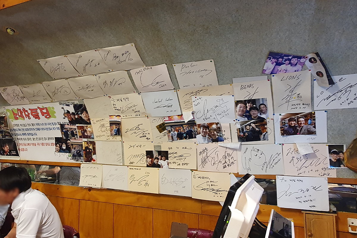 牆上貼滿嚟過嘅名人,佢哋嘅簽名,同埋拍攝《孝利家民宿》嘅相。