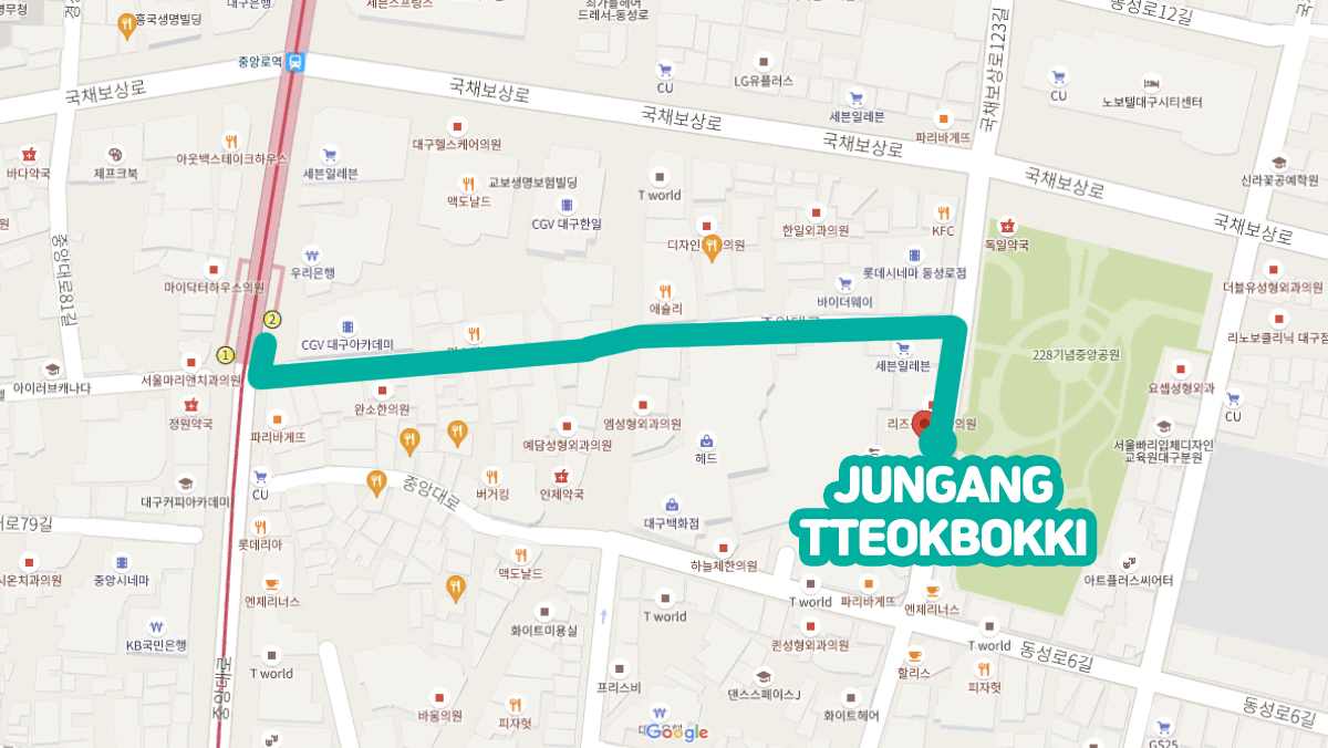 由大邱1號線中央路站2號出口出嚟之後,行入左邊巷仔,見到2.28紀念公園時,再轉入右邊小巷,第三座建築物就係中央炒年糕。