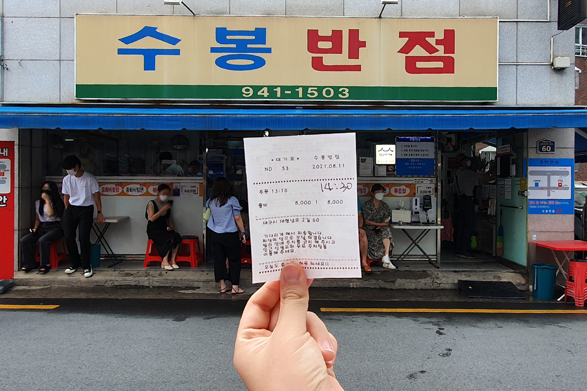 小編係13:30到,13:55嘅時間段已經截咗,最快就要等到14:30。不過因為只要按時去到餐廳門口就可以,所以喺餐廳門口等,或者去其他地方行住等。 附近係大邱大型市場之一嘅七星市場,所以行完再返嚟。每張飛都有號碼,到入場時間,老闆會喺門口嗌,嗌到自己嘅號碼時入去就可以啦!