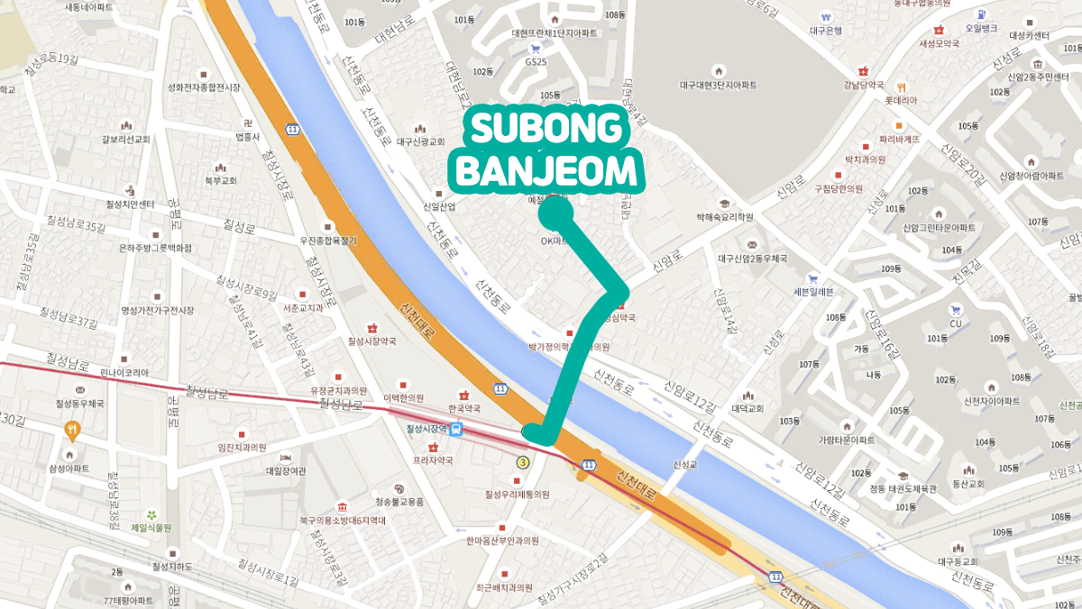 由大邱1號線七星市場站4號出口出嚟,行過左邊見到嘅橋之後,行入左邊嘅小巷就到。