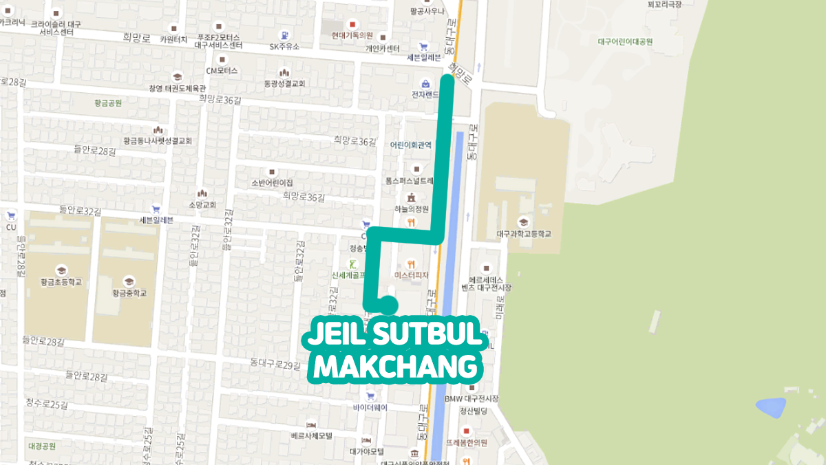 由大邱3號線兒童會館站1號出口出嚟,經過左邊嘅馬路之後,靠住左邊直行。 到第二個街頭轉入去,再行一分鐘就到。