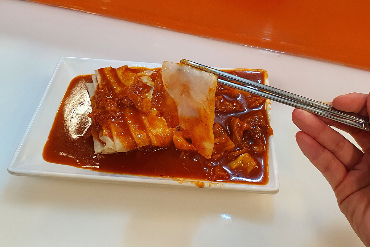 扁餃子沾滿炒年糕汁,就咁食都好好味,但同埋炒年糕一齊食嘅話,佢嘅價值先體現到出嚟! 用扁餃子包住炒年糕一啖咁食,口感更加豐富,更加好味。