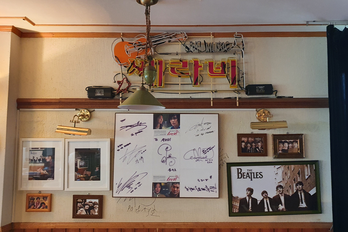 一邊嘅牆上有韓劇《愛情雨》演員嘅簽名,同埋幾幅Beatles嘅相,散發住濃濃嘅復古味道。