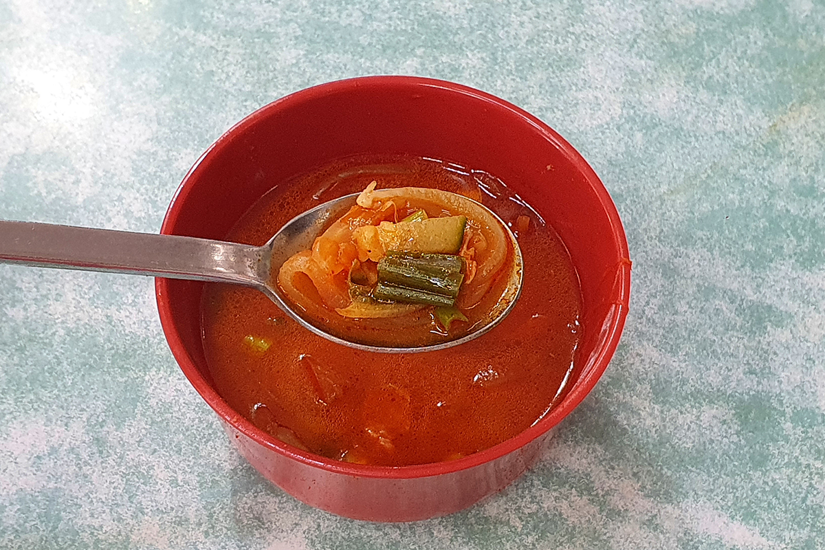 首先,跟住白鍾元喺節目中介紹嘅,先舀一啖海鮮麵湯嚟試吓,入面翠玉瓜、洋蔥、蔥等多種蔬菜同海鮮,個湯嘅味道好濃又帶辣。
