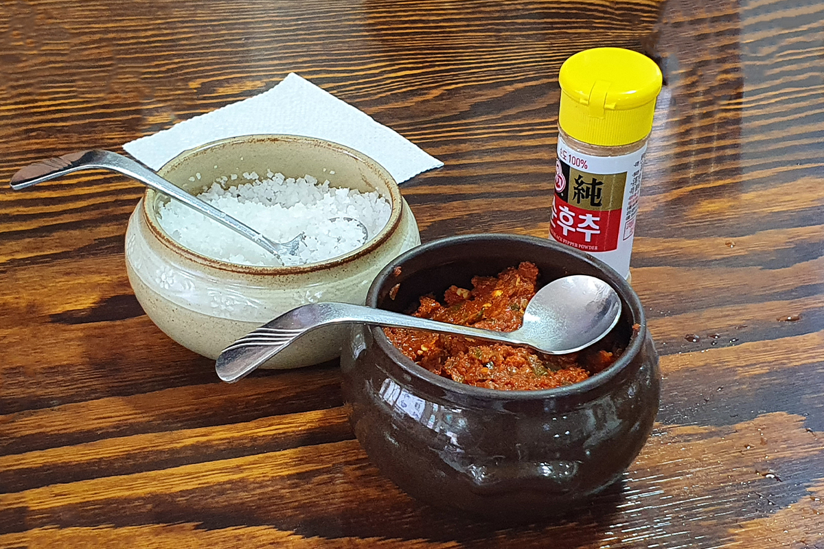 呢度嘅血腸湯飯喺食之前一定要先調味。 鹽、調味辣椒醬、胡椒(由左到右)。 如果鍾意鹹味,可以放鹽;如果鍾意辣辣哋,可以加調味辣椒醬,鍾意再刺激啲嘅彈以加埋放胡椒,按個人喜好加就得㗎啦!