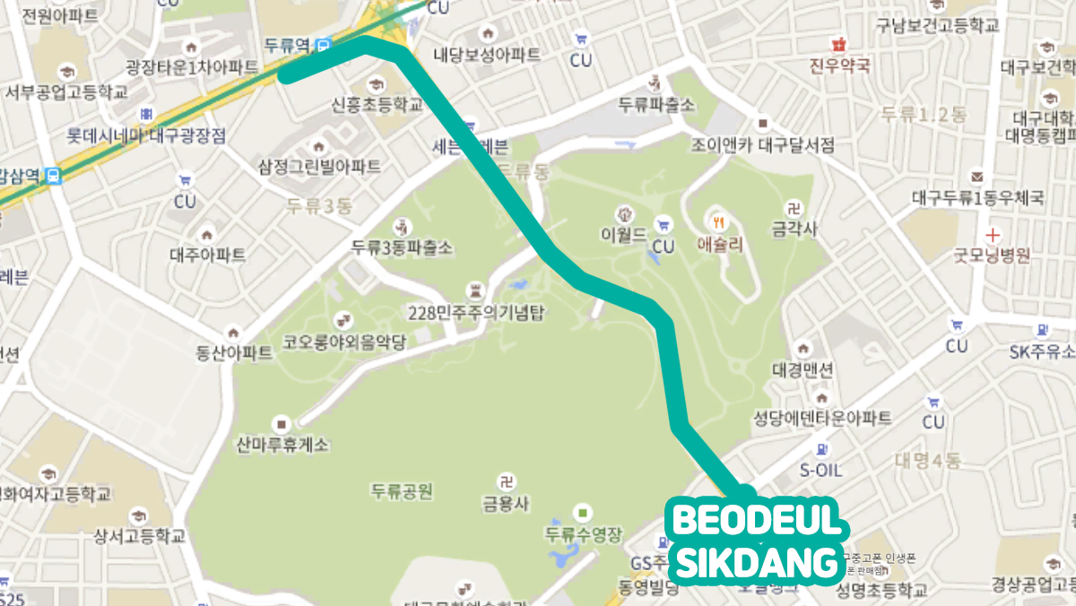 大邱地鐵3號線2號出口出嚟之後,穿過十字路口沿着巷仔行大約 5 分鐘就到。