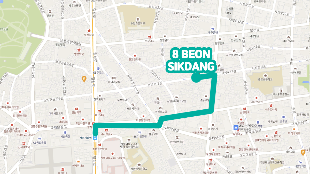 由大邱地鐵3號線西門市場站1號出口出嚟之後,轉右直行,去到十字路口就過左邊嘅馬路,再直行一個街口,轉入左邊嘅小巷就到。