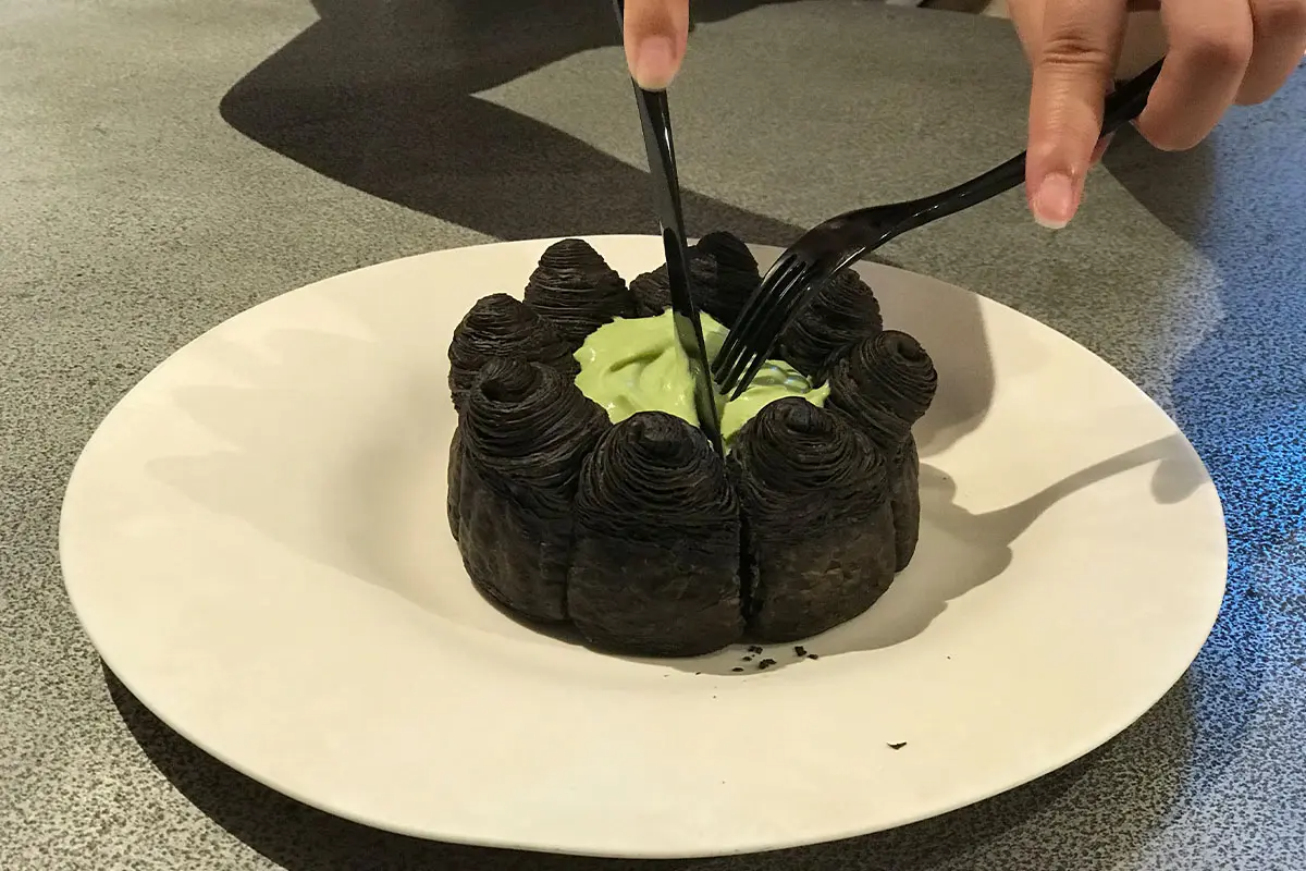 一上到枱,比起話覺得佢係甜品,更加覺得似係藝術品,之前Treasure成員就係食呢個。佢入面有好多綠茶醬,牛角包外脆內軟,同綠茶醬一齊食好夾,小編覺得三個人食啱啱好,唔會太膩。