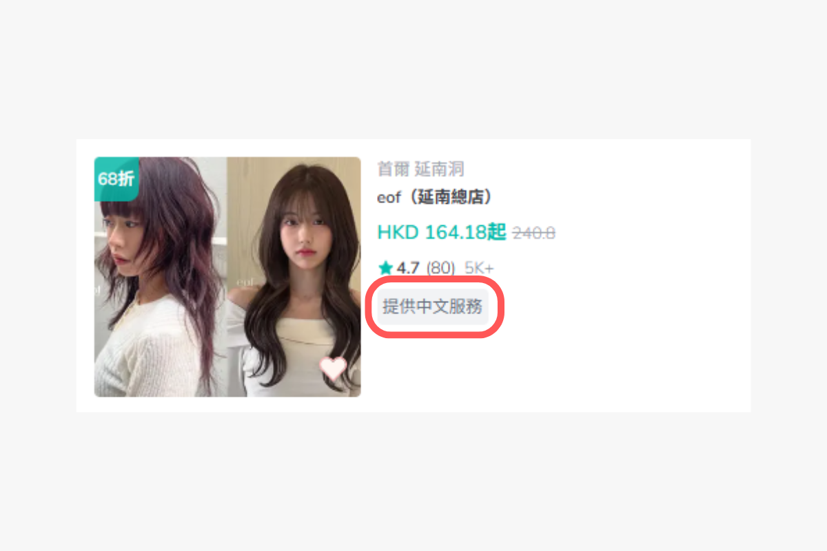A:髮型屋通常都唔會提供翻譯服務,不過好似弘大、延南等人氣地區同觀光區嘅salon可能會有識講英文嘅職員或者髮型師。如果大家想make sure有冇提供指定語言服務,可以透過Creatrip預約,頁面上會標明!