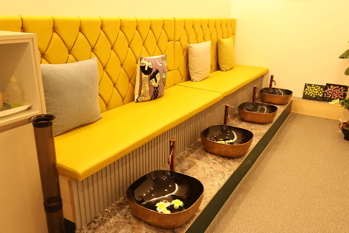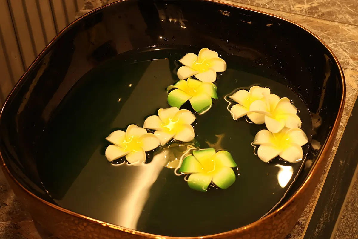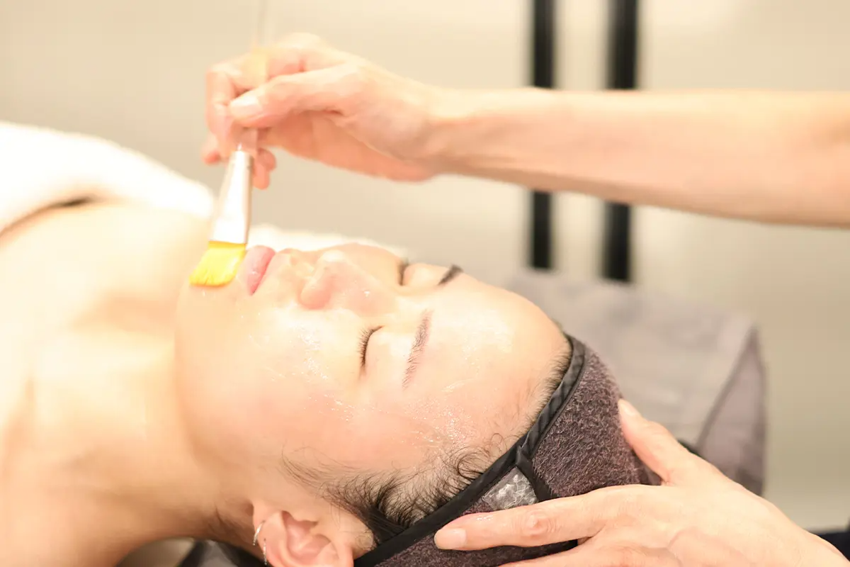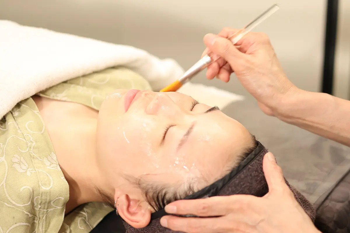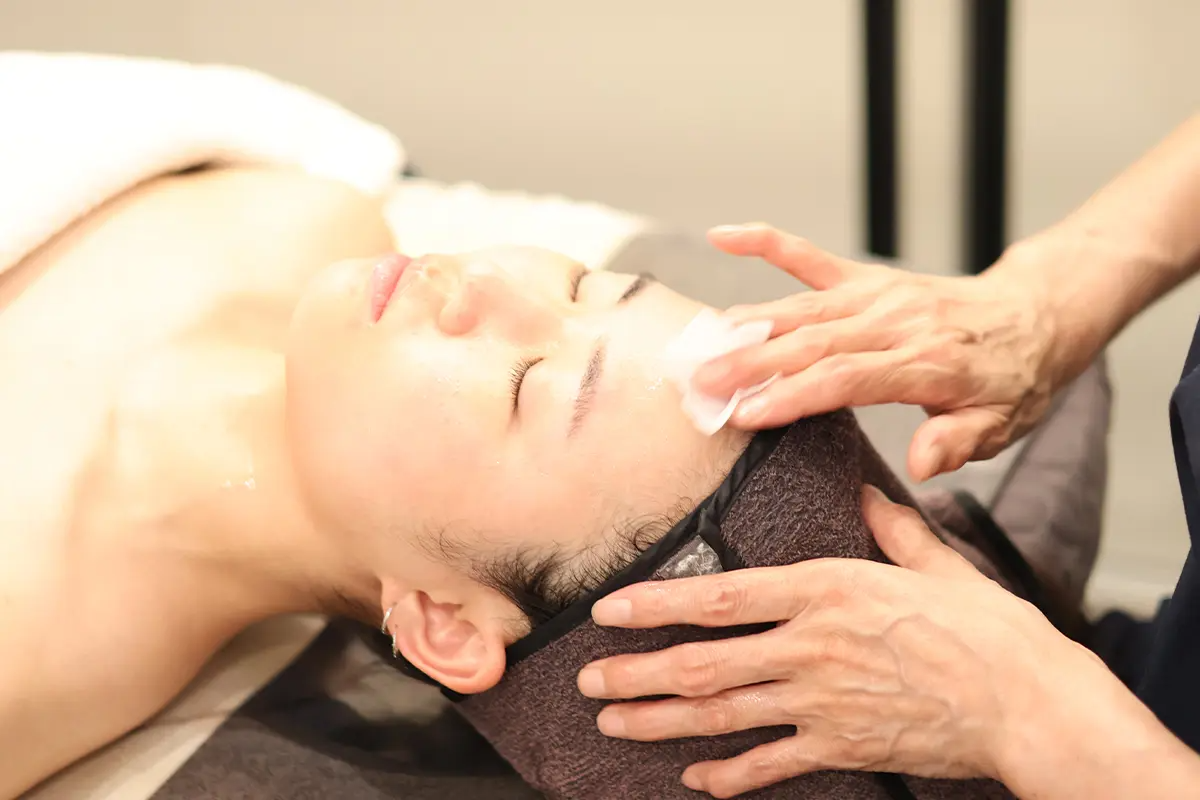 | 足浴 → 頭皮按摩 → 面部清潔 → 面部深層清潔 → 身體按摩(背肩胛骨、上胸部)→ 副乳按摩 → 頸部淋巴按摩 → 面部護膚 → 舒緩鎮靜面膜 → 配合肌膚類型面膜 → 最終收尾步驟 |