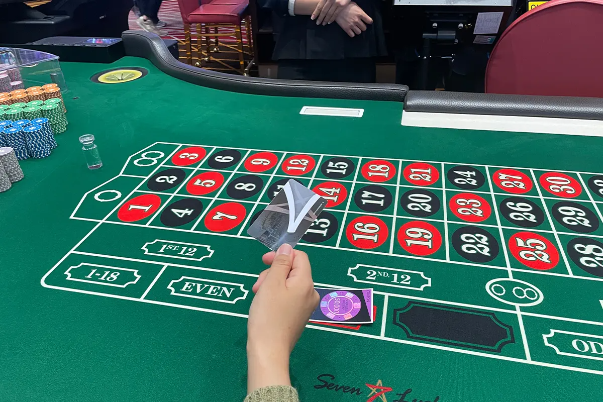 我打算玩輪盤,坐在桌子上,把免費籌碼優惠券放在下注的地方。