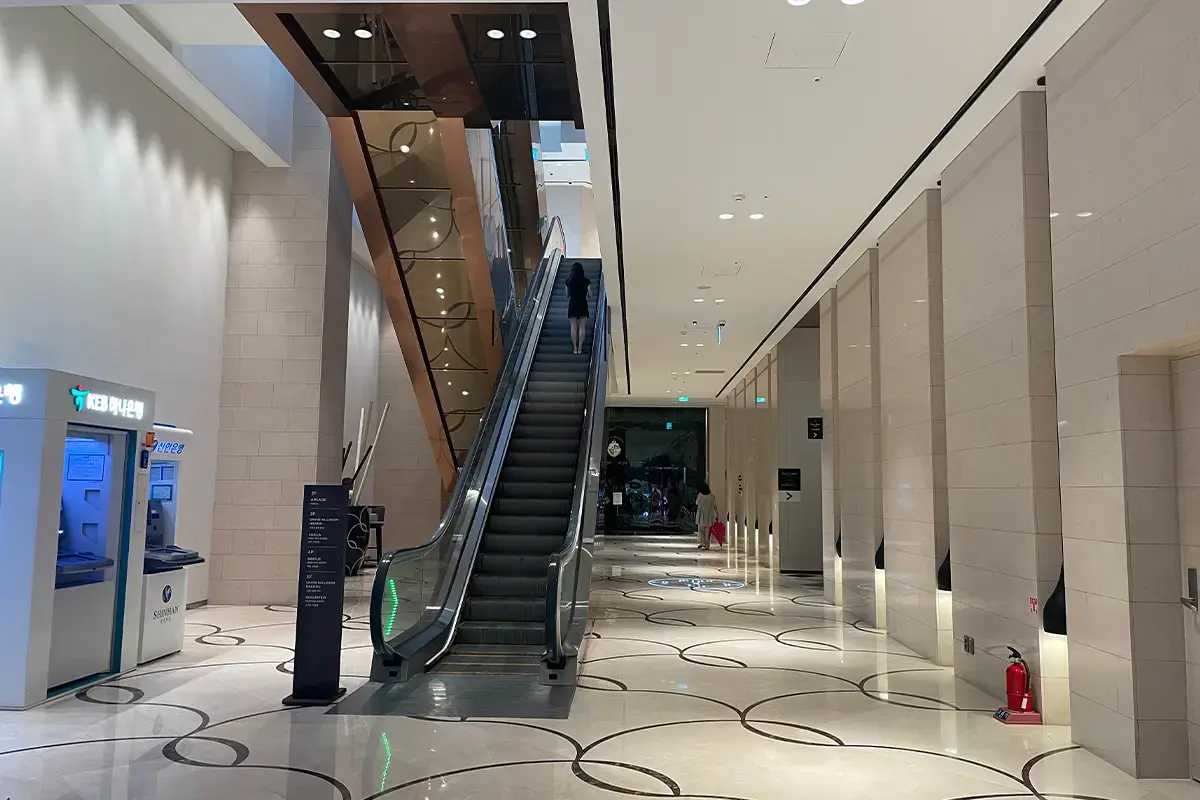 行到一段時間,你會見到七福娛樂場專用嘅升降機,升降機嘅左邊有手扶梯。