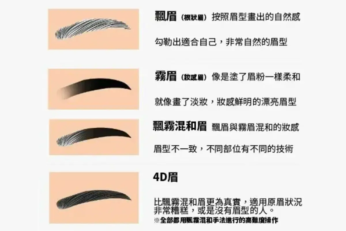 - 4D眉(4D 기법):霧飄混合眉升級版,效果更真實;推薦需要重新設計眉型、幾乎冇咩眉毛嘅人做