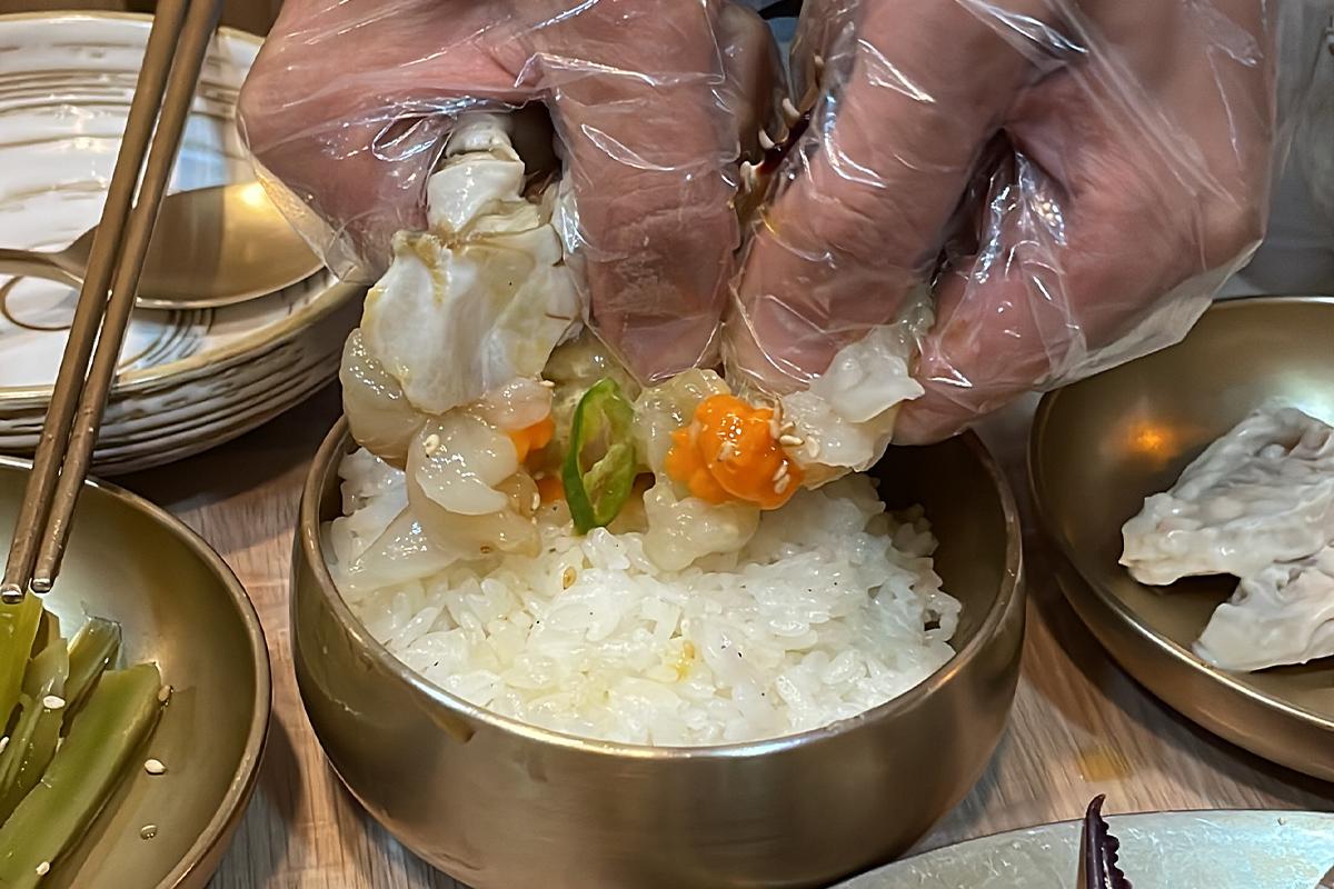 將蟹肉同蟹膏唧落碗飯到,再加鋪頭嘅秘製醬汁撈埋一齊食。