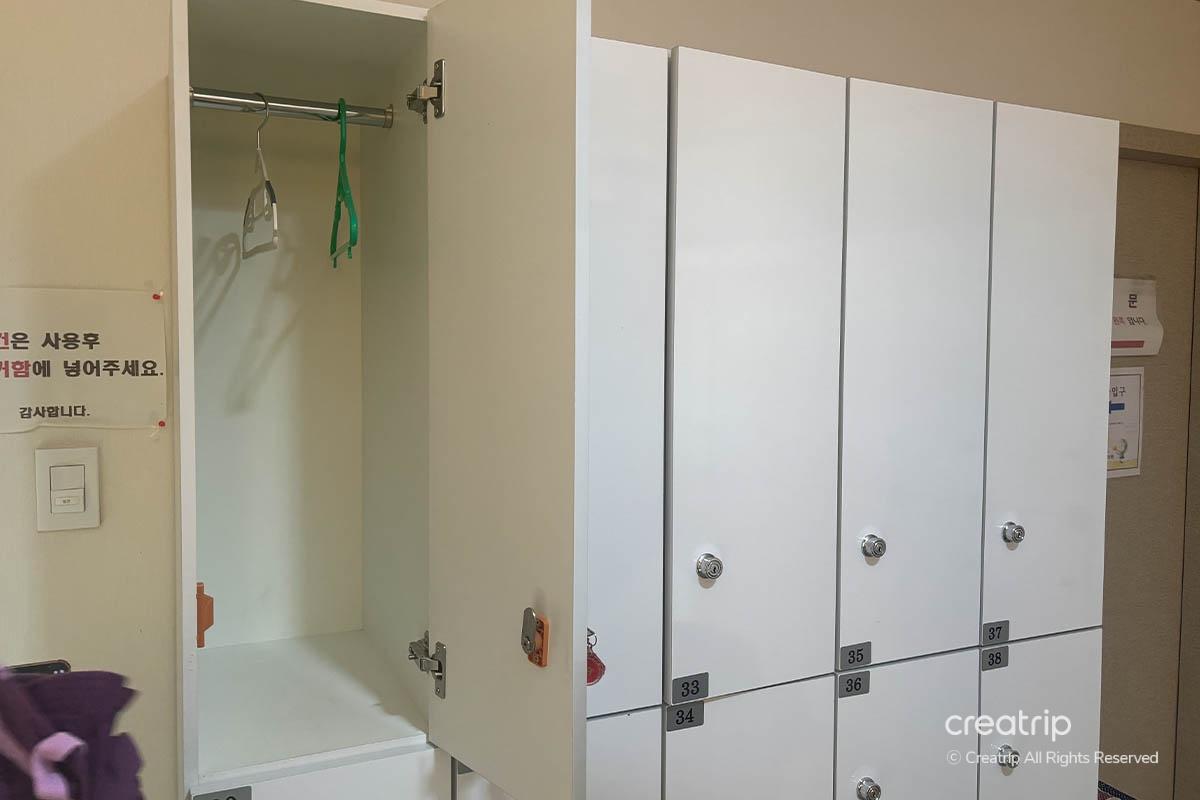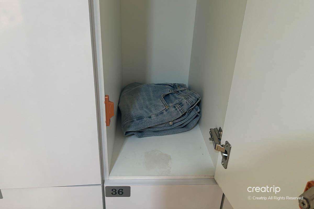 換上準備好的汗蒸服後,把穿來的衣服整理好後放進櫃子裏。