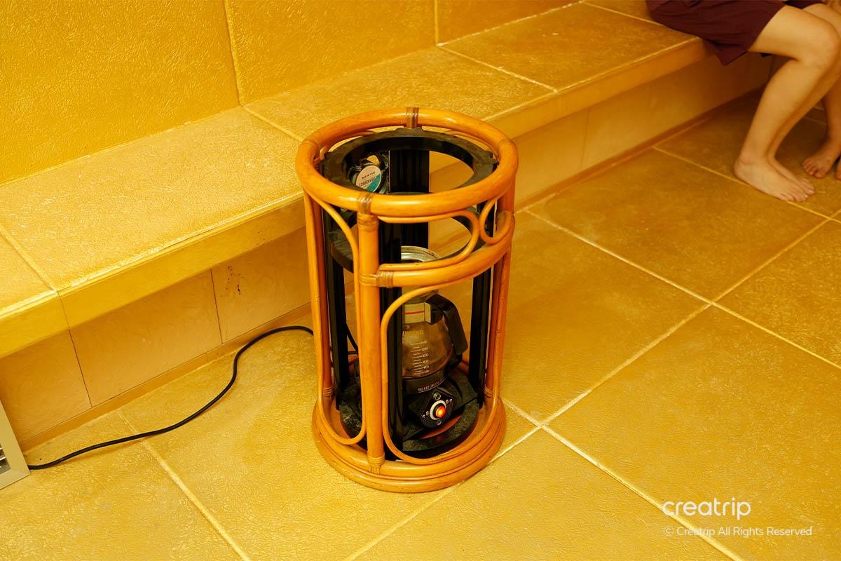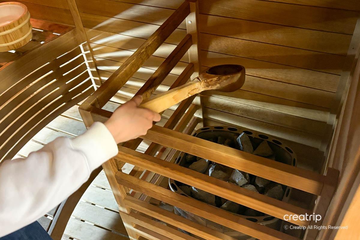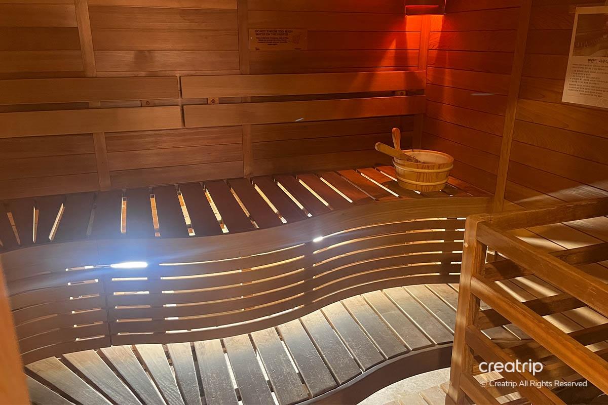 接下來爲了通過汗水排出身體的代謝物,進入桑拿浴。 在桑拿浴裏待3~5分鐘左右。