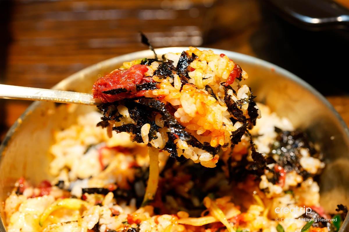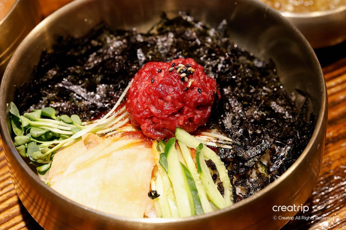 如果大家覺得齋食肉大家唔飽,記住要食埋生牛肉拌飯,新鮮生牛肉絲加上蔬菜、麻油同辣椒醬,撈埋飯真係好惹味!