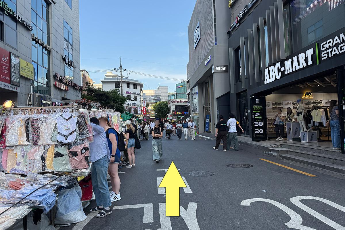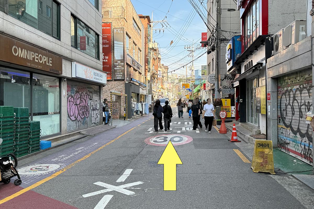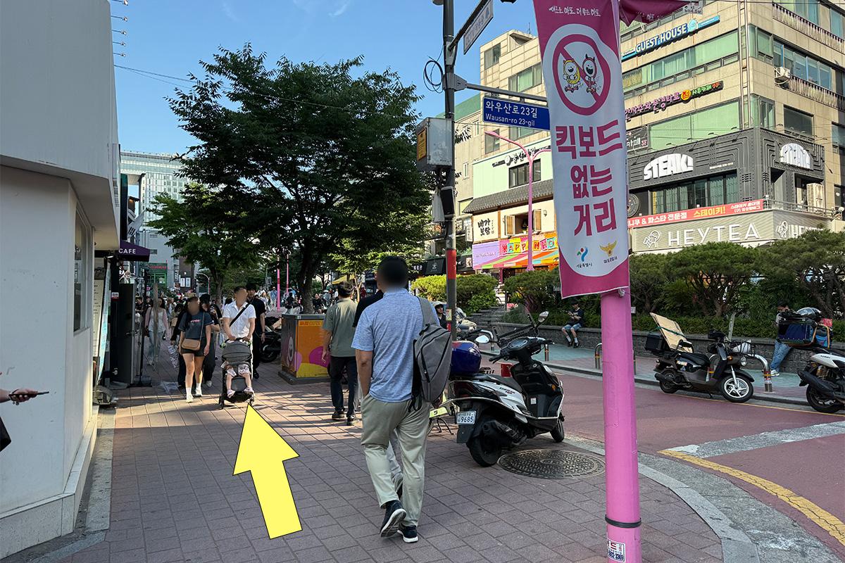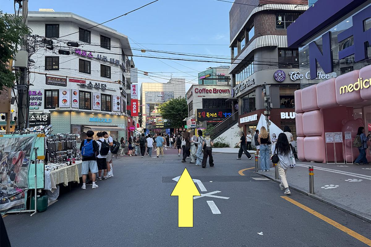 從弘益大學入口站步行約 9 分鐘,可以在弘益大學街上購物或探訪美食店,感覺很好。