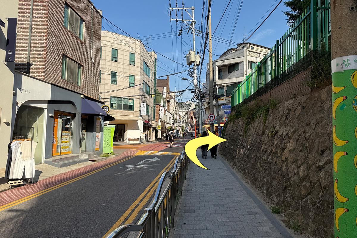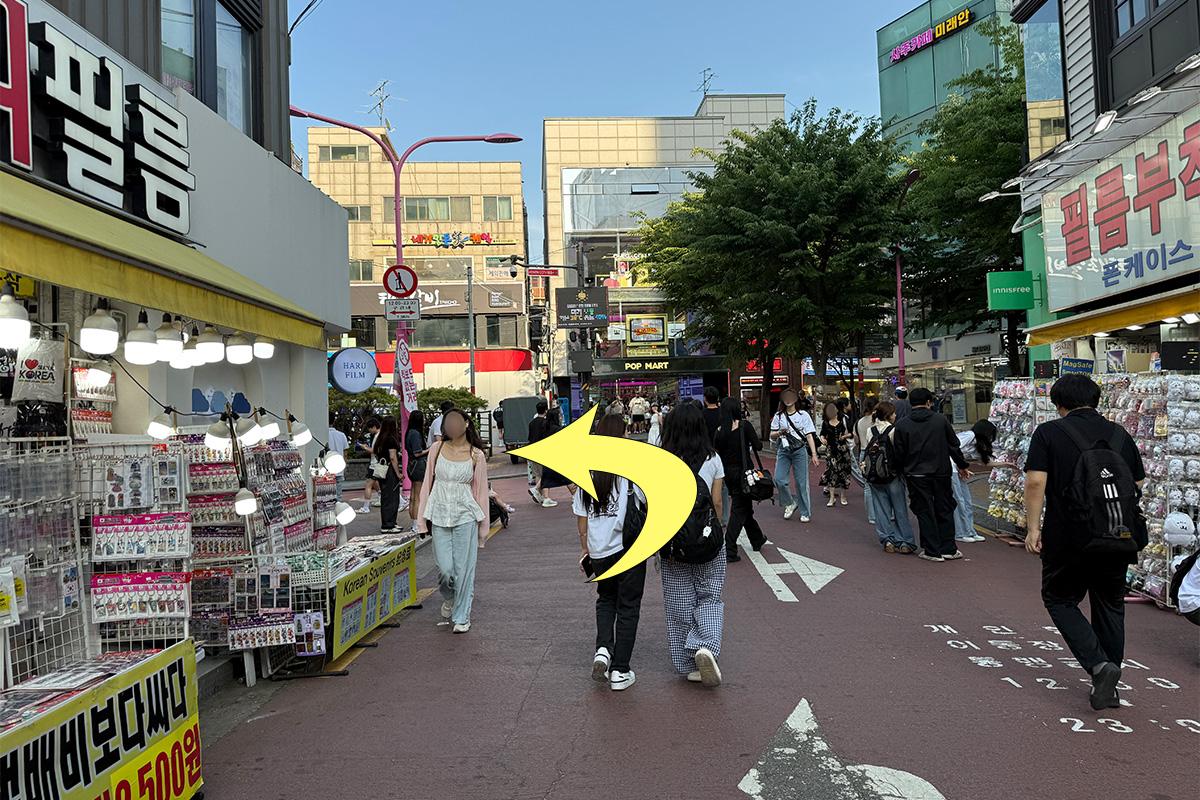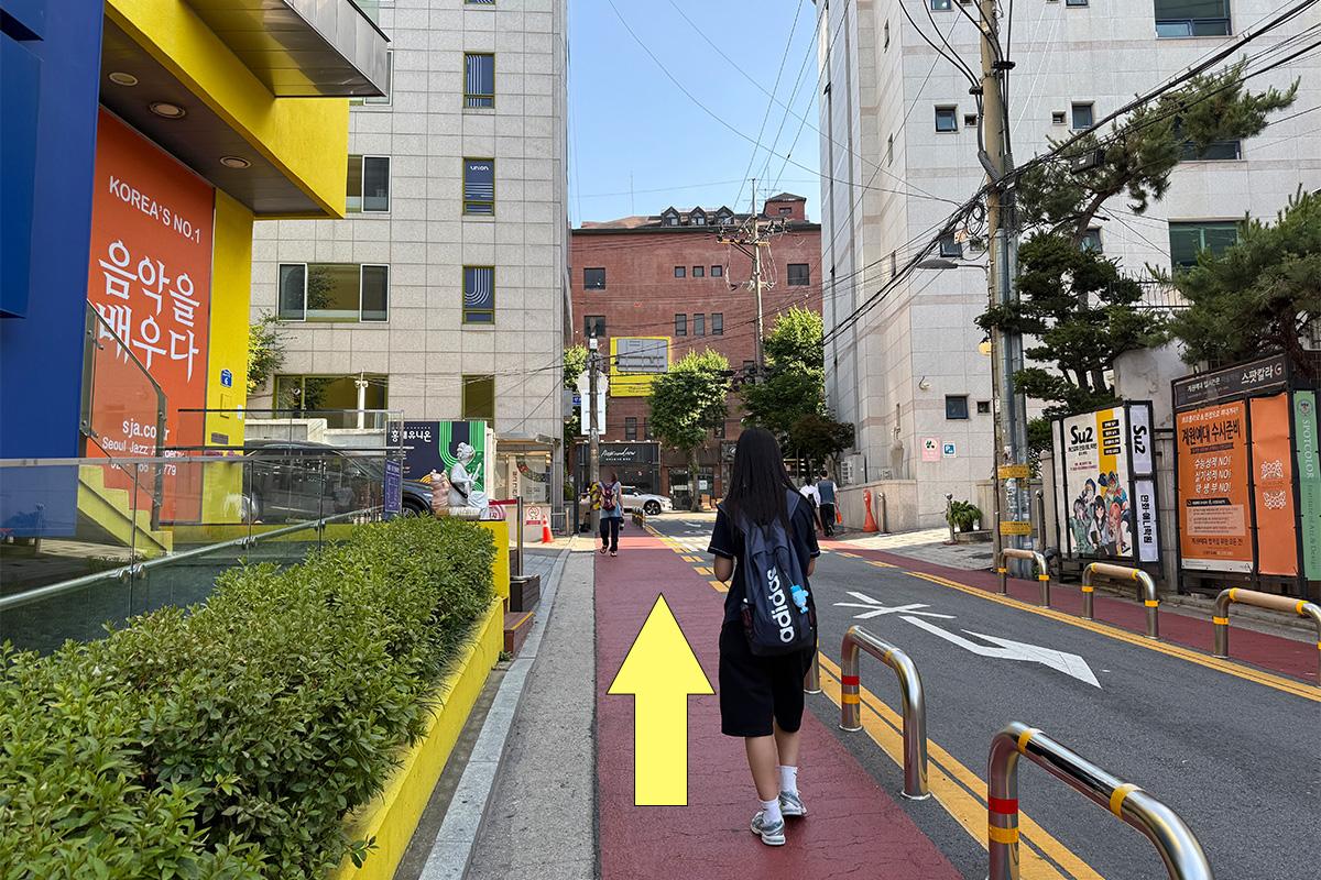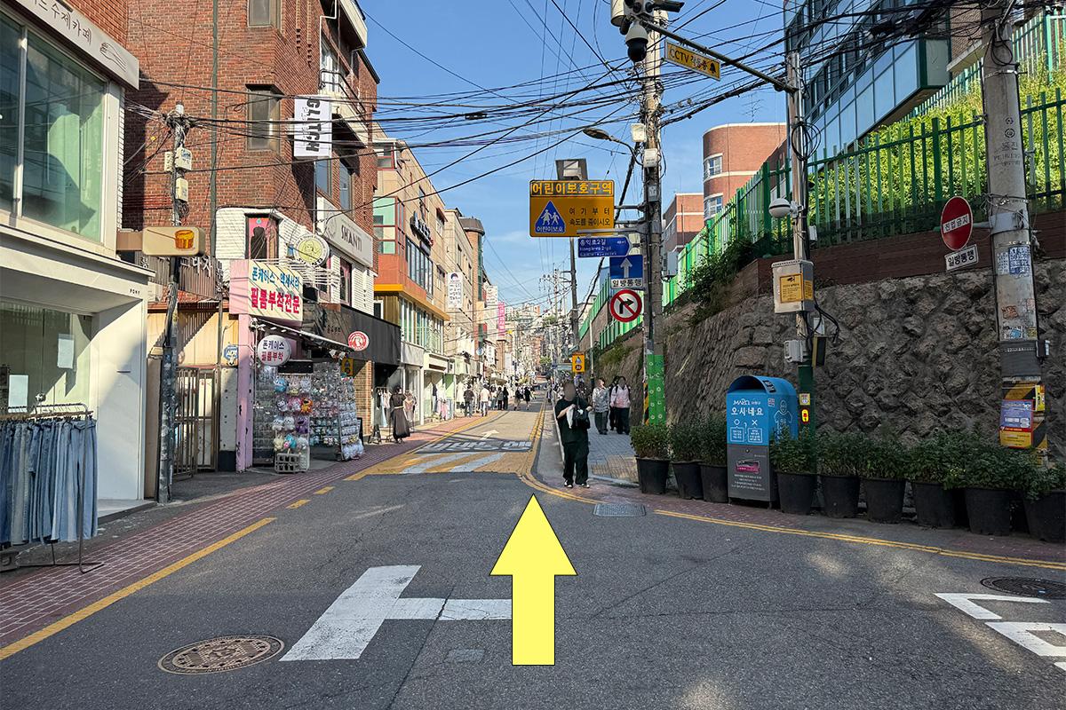 從弘益大學入口站步行約 9 分鐘,可以在弘益大學街上購物或探訪美食店,感覺很好。