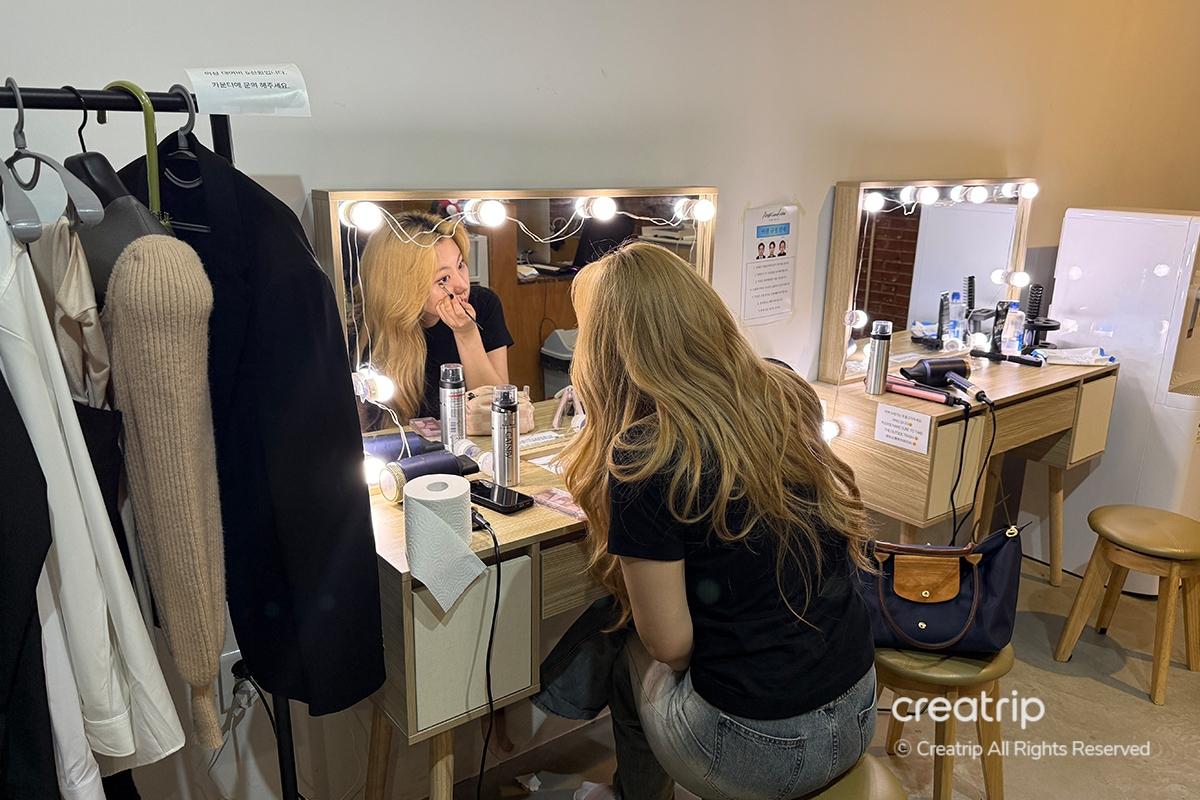 開拍前,在梳妝檯上輕輕補了妝。